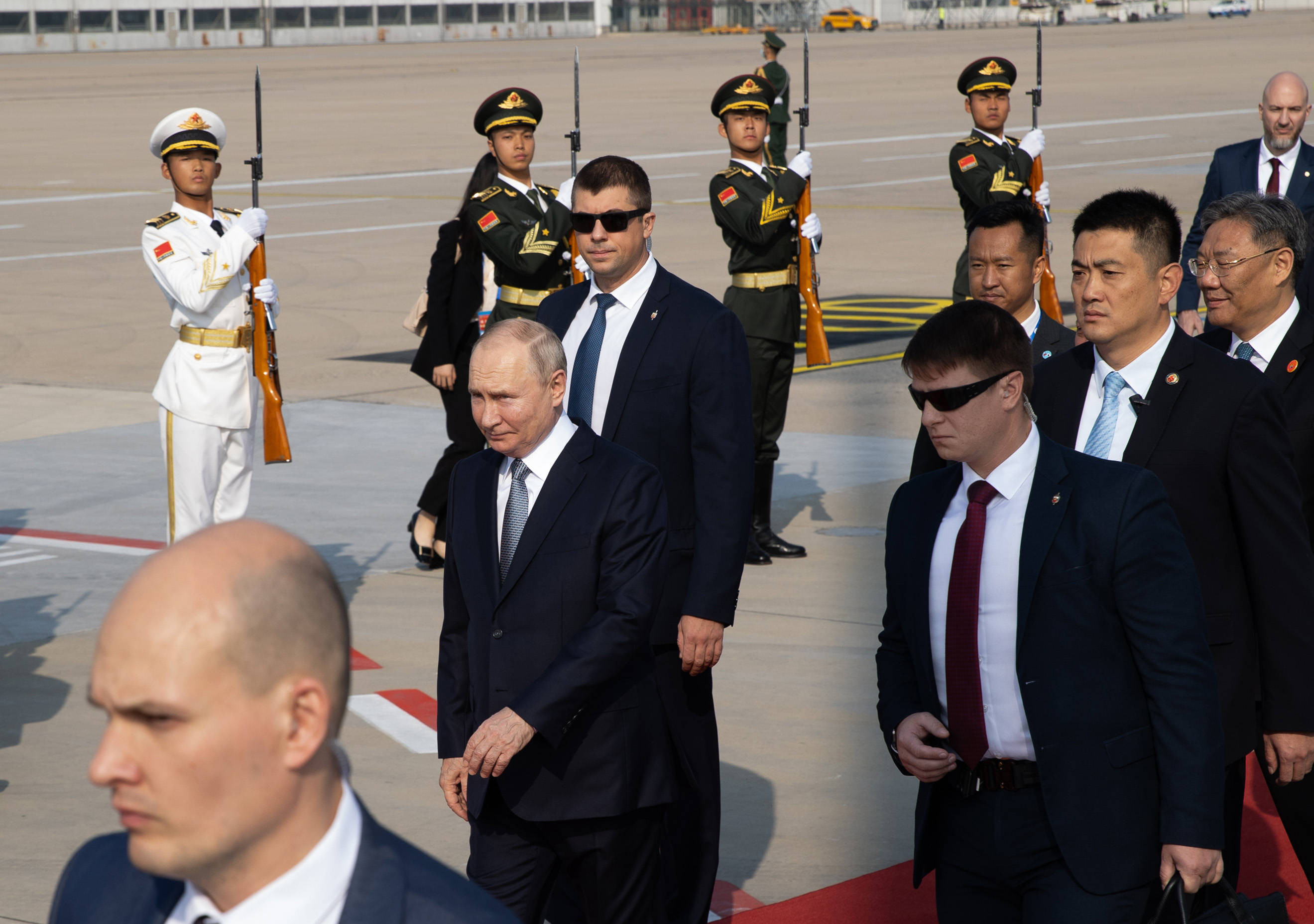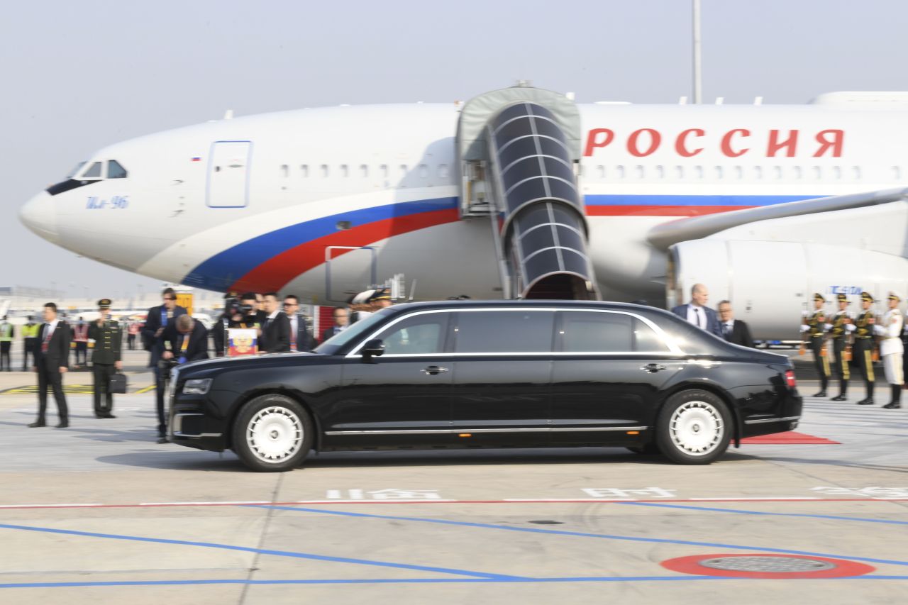 Imaginile surprinse marți la sosirea în China îl arată pe Putin coborând din avionul prezidențial pe o scară special dotată pentru el cu un panou gros antiglonț, de culoare fumurie, menit să-l apere de lunetiști sau drone ucigașe.