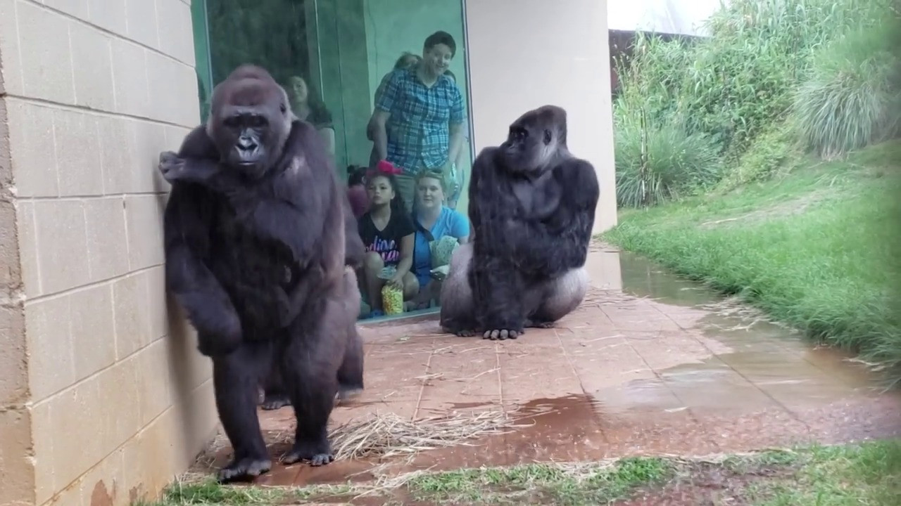 În înregistrare se observă cum 4 gorile, 2 femele cu pui și doi masculi, se adăpostesc de ploaie, apoi pentru a evita apa se lipesc de un zid și merg în șir indian. Ba chiar masculii fac o strâmbătură atunci când calcă în apă și sunt udați de ploaie, întocmai unui om.