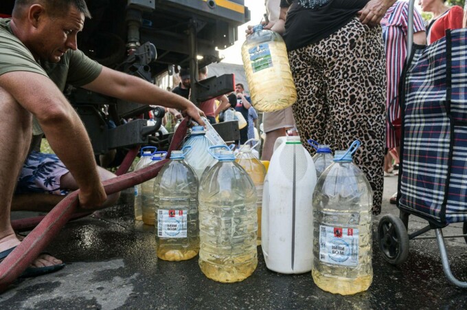Donețk, începutul lunii septembrie 2025. O mașină oprește în fața unei grădinițe din oraș. O femeie din mașină filmează doi tineri care umplu cu apă un rezervor de o tonă în spatele gardului grădiniței. O femeie în vârstă stă de cealaltă parte a gardului, afară. Femeia îi acuză pe toți trei că fură apă de la copii.