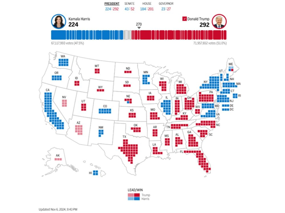 LIVE TEXT | Rezultate alegeri SUA. Este oficial: Donald Trump obține 292 de mari electori, față de Harris, care are 224