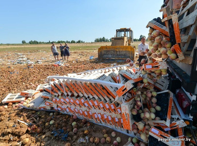 In timp ce presa internationala relateaza ca Moscova isi taie singura craca de sub picioare, din mandrie, distrugand tone de alimente aflate sub embargo, cativa rusi din Krasninsky, regiunea Smolensk, au fost fotografiati in timp ce culegeau de prin frunctele si legumele depozitate in zona de distrugere.