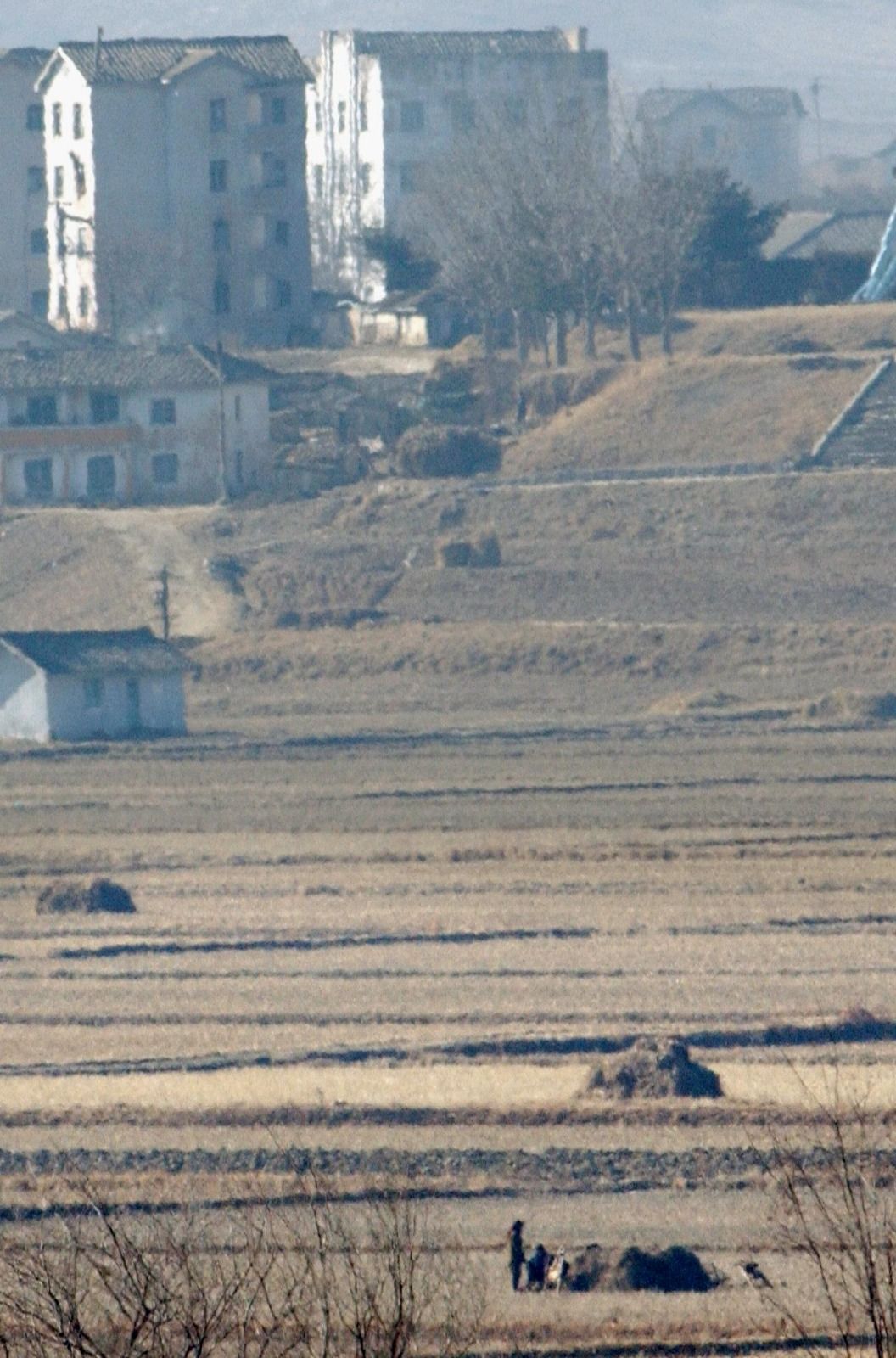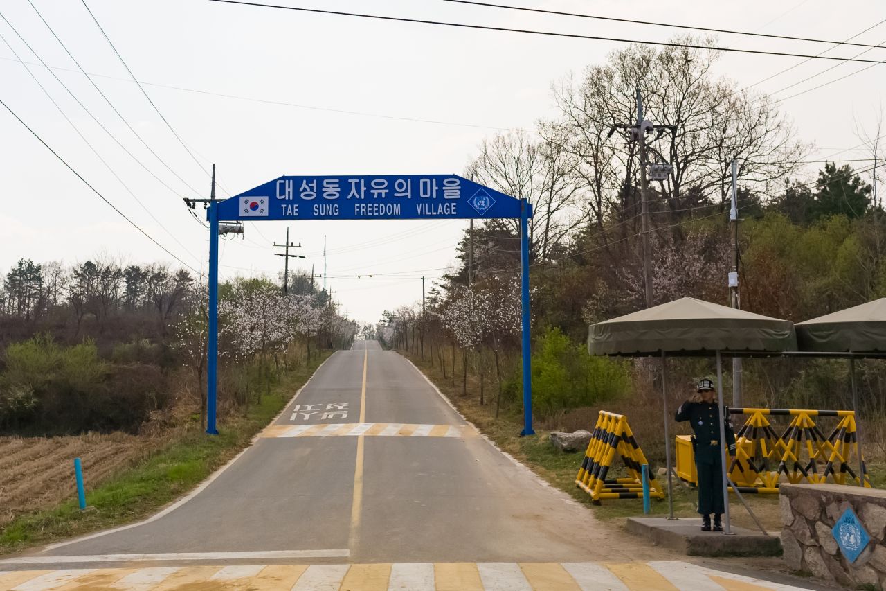 Nu există garduri sau bariere care să separe fizic satul de Coreea de Nord. Doar un semn ruginit marchează o linie invizibilă, împreună cu o tufă densă de copaci și tufe. Când zgomotul plugului se estompează, se aude sunetul ușor al soldaților care cântă pe partea nordică.