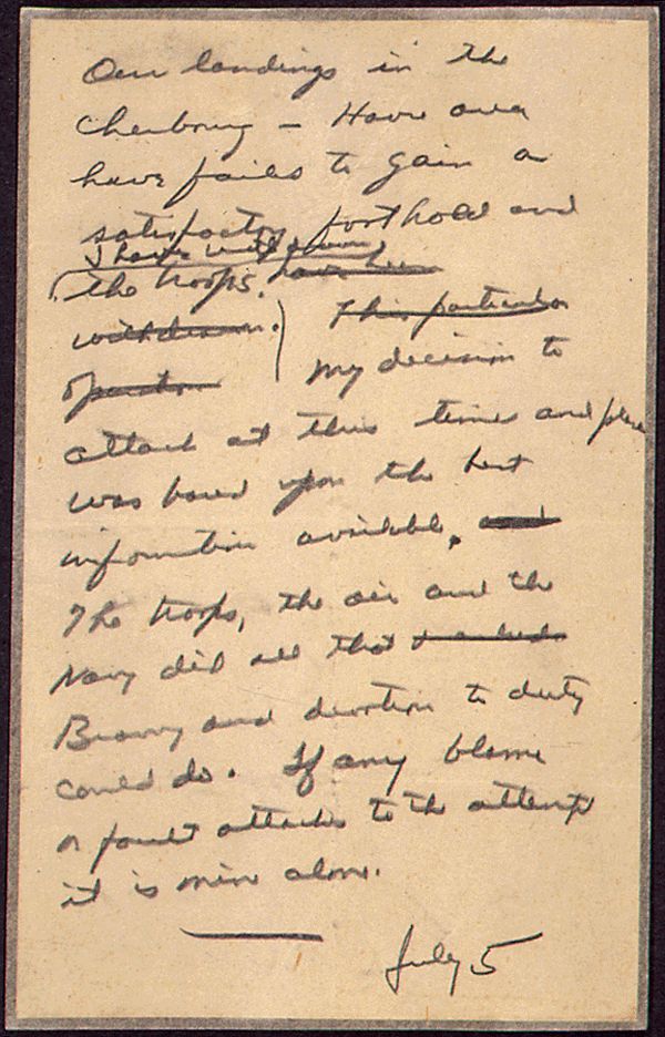 "Debarcarea in Cherbourg-Havre nu a dat rezultate satisfacatoare si am retras trupele. Decizia de a ataca in acest moment s-a bazat pe cele mai bune informatii pe care le aveam la dispozitie. Trupele, atat cele din aer cat si cele de pe mare au aratat devotament total. Daca este vina cuiva, este numai a mea", sunt cuvintele in scrisoare.