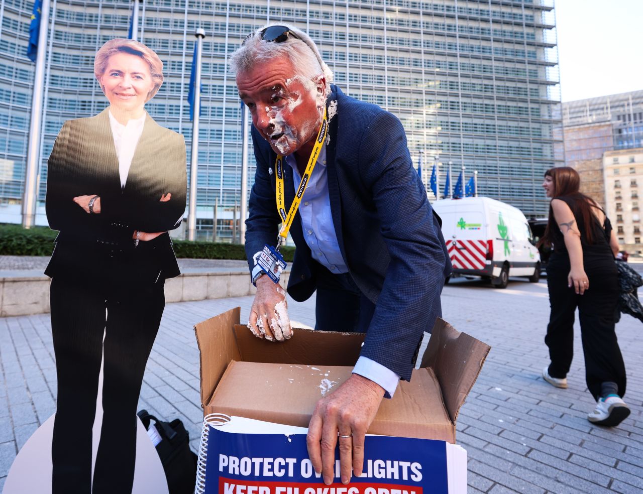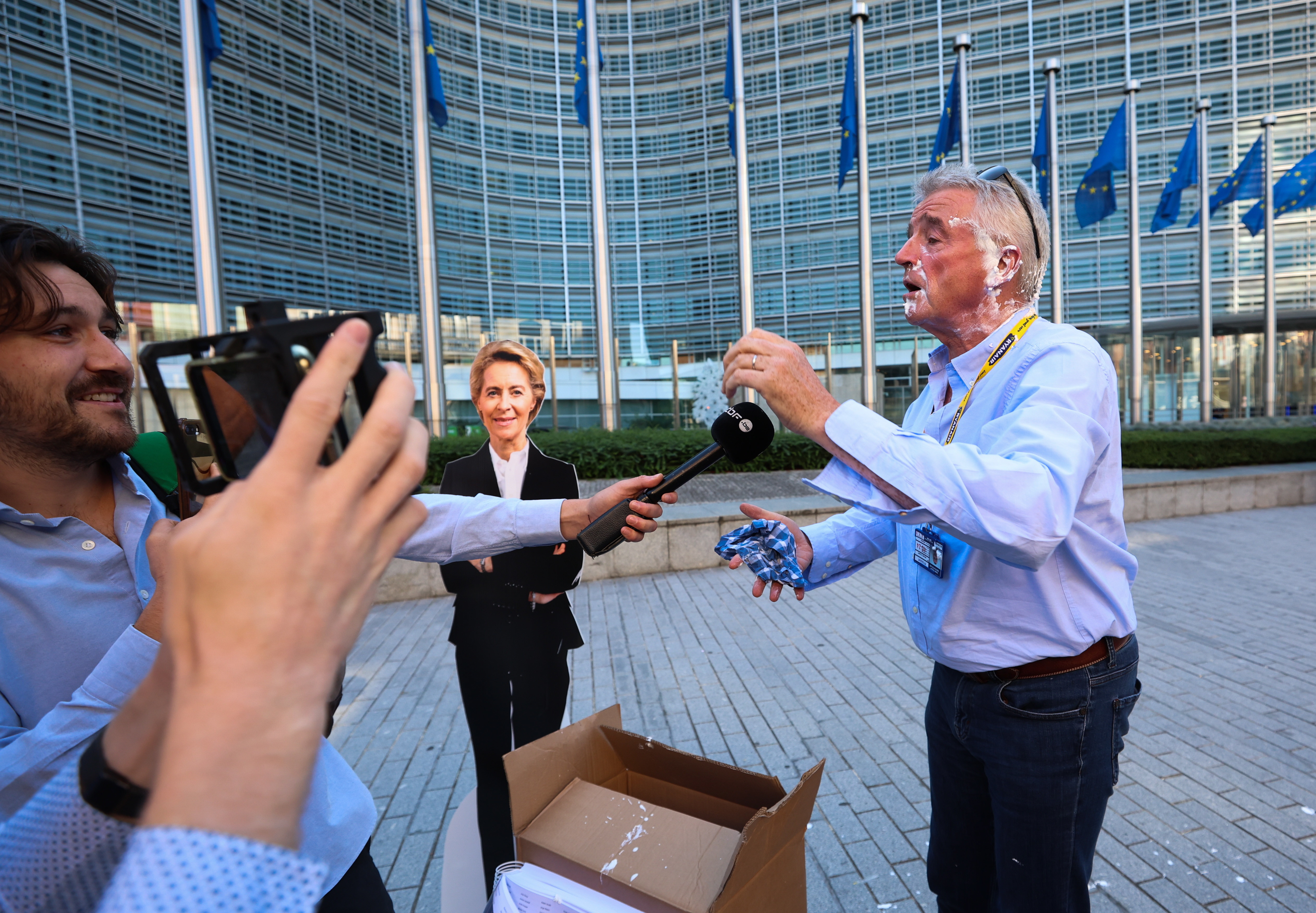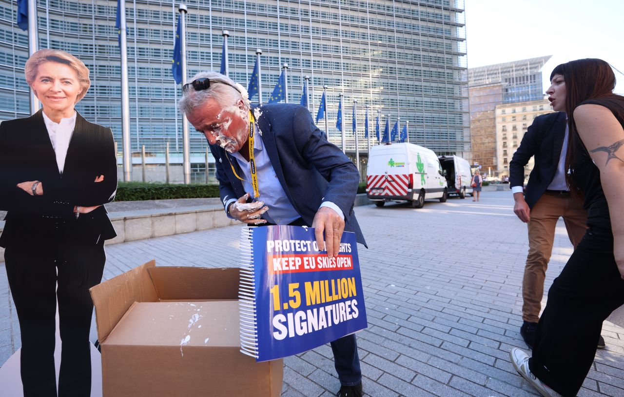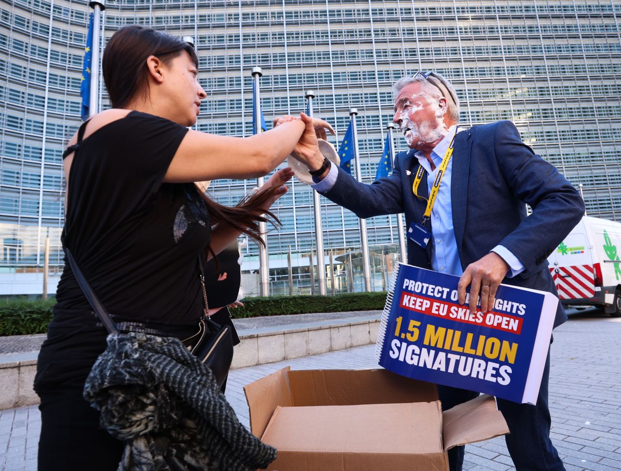 Șeful Ryanair, Michael O'Leary, a fost lovit în față cu plăcinte de către activiști de mediu în timp ce se pregătea să susțină o conferință de presă în Bruxelles, joi.