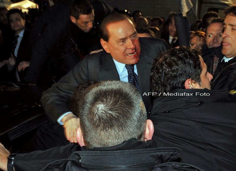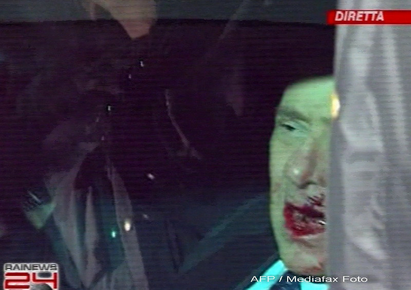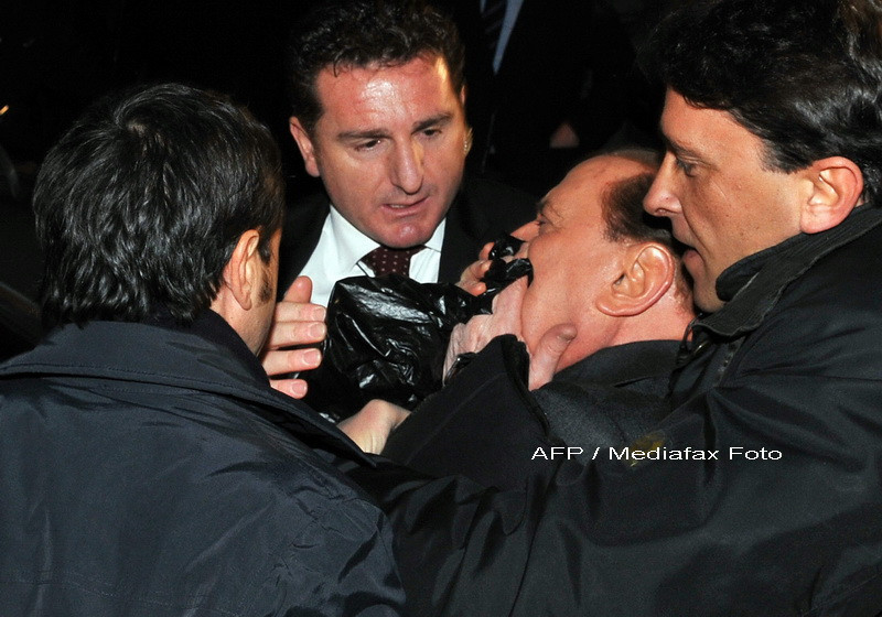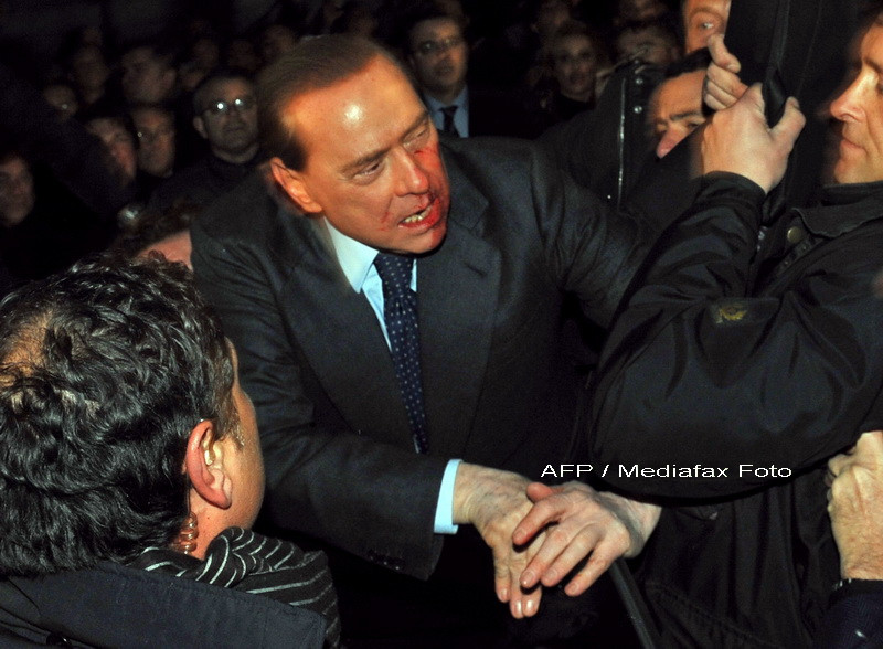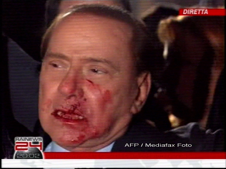 La finalul unui miting, premierul italian a fost lovit in figura cu o statueta cu soclu din fier, aruncata de un individ, de 42 de ani, despre care presa scrie ca este de 10 ani in tratament pentru afectiuni psihiatrice.