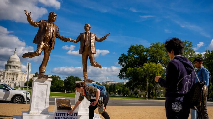 Grupul anonim The Secret Handshake, aflat în spatele statuii, a creat această lucrare de protest pentru a evidenția prietenia anterioară dintre Trump și Epstein, în contextul presiunilor ca fostul președinte să facă publice mai multe documente legate de condamnatul pentru abuzuri sexuale, scrie publicația Axios.