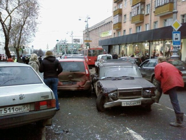 S-a intamplat la Perm, in Rusia. Desi nu e de ras, "aventura" cetateanului de la volan ne-aduce putin aminte de jocul Carmageddon, care facea furori in urma cu un deceniu: 20 de masini facute praf si 4 raniti!