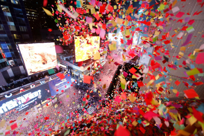 Sărbătoarea a atras spectatori din întreaga lume, care au purtat ochelari haioși, au aruncat confetti și au cântat „Auld Lang Syne” și „New York, New York” la miezul nopții, relatează The New York Times.