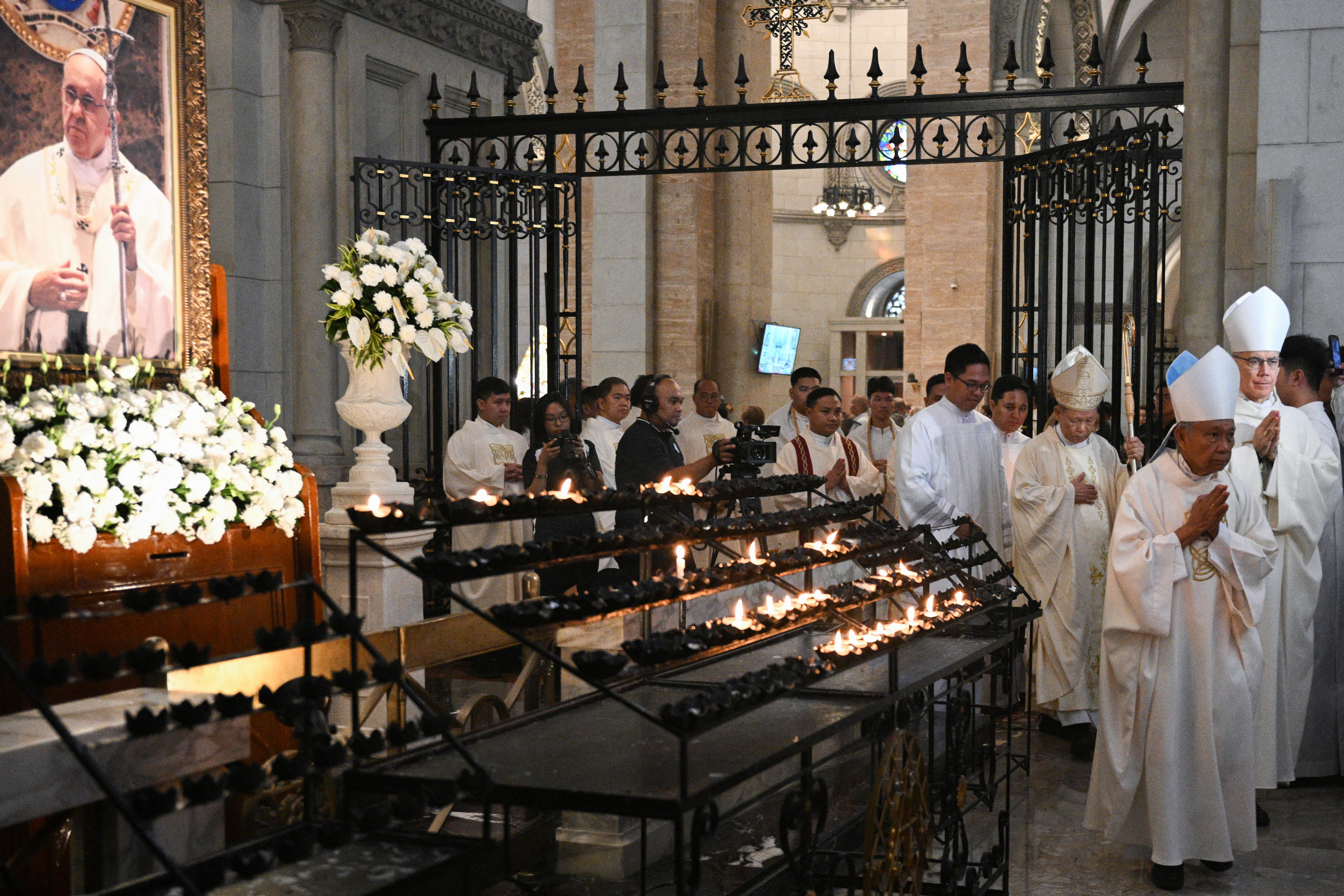 Patriarhii și cardinalii trebuie să poarte mitrele de damasc alb (mitră - pălărie religioasă de culoare albă, din damasc, purtată de episcopi și lideri religioși), iar arhiepiscopii și episcopii trebuie să fie îmbrăcați cu amica (amica - veșmânt liturgic alb, dreptunghiular, purtat pe umeri de preoți și episcopi), superba (un veșmânt deosebit de calitate sau impunător), cingătura (cordon care ține veșmintele la talie) și stola roșie (bandă lungă de material purtată pe umeri de episcopi, simbol al autorității religioase, de culoare roșie).