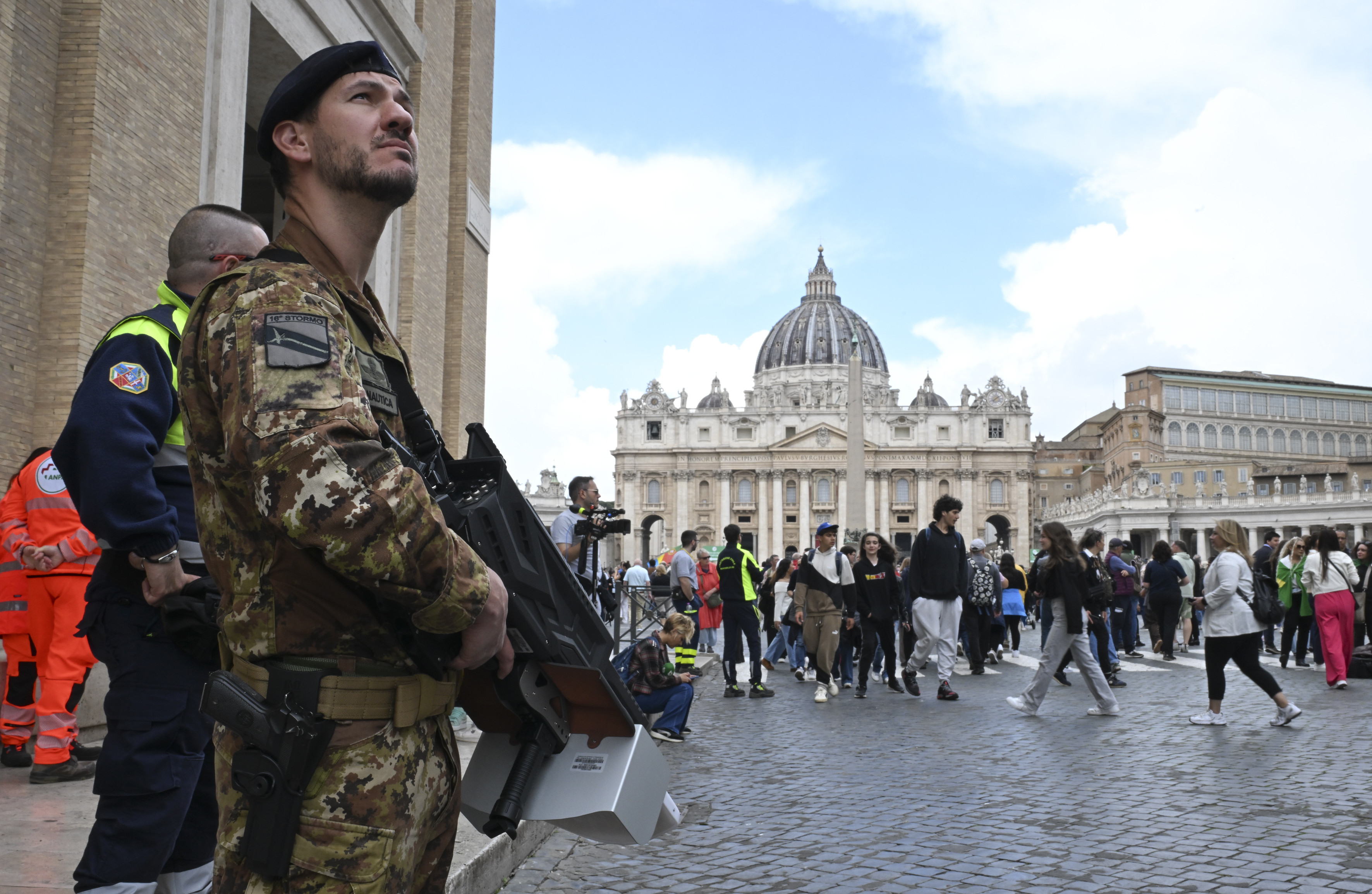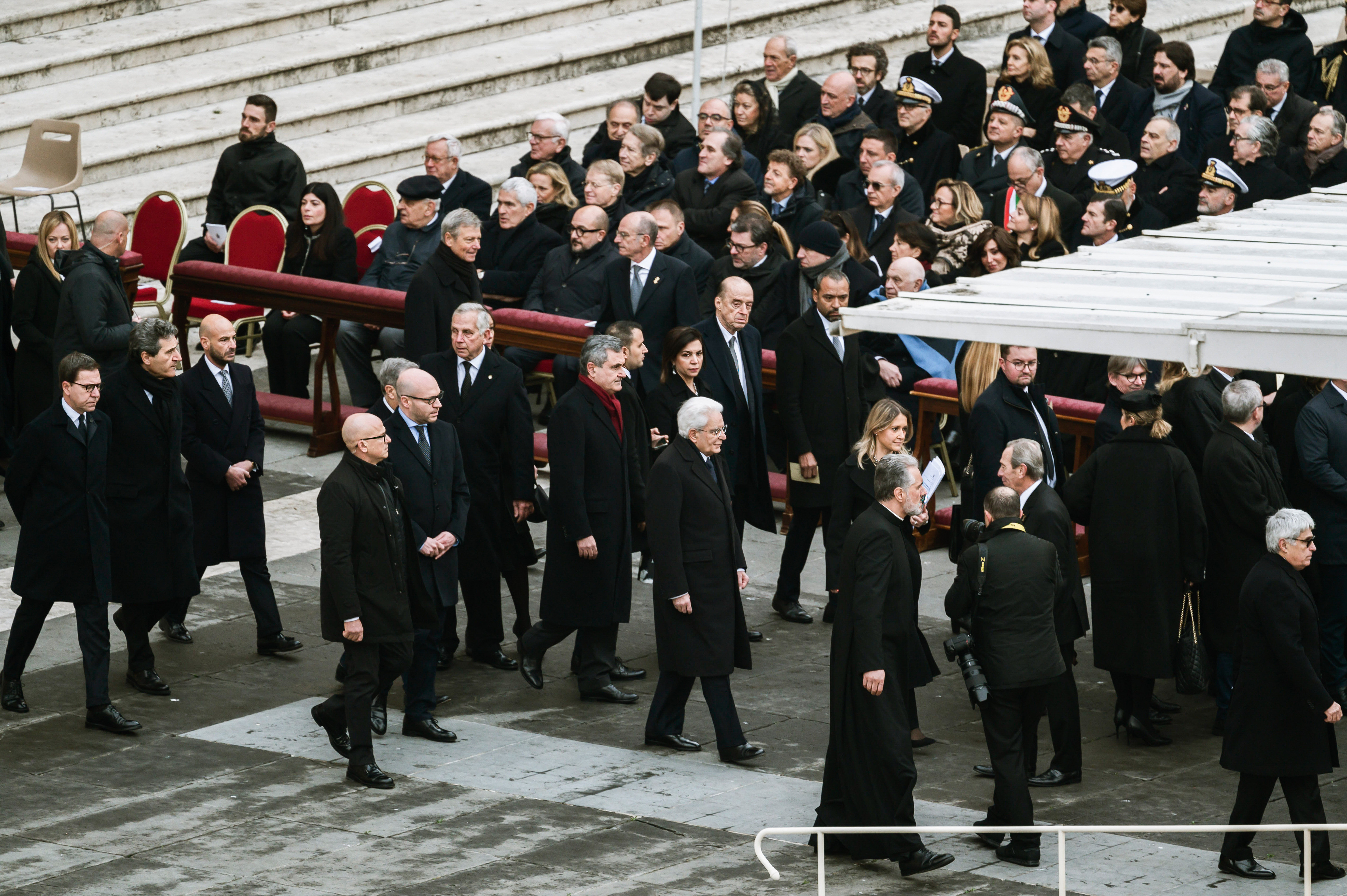 Locurile din față sunt rezervate președinților Italiei și Argentinei, iar delegația italiană este cea mai numeroasă, incluzând președintele Sergio Mattarella și alți oficiali importanți.