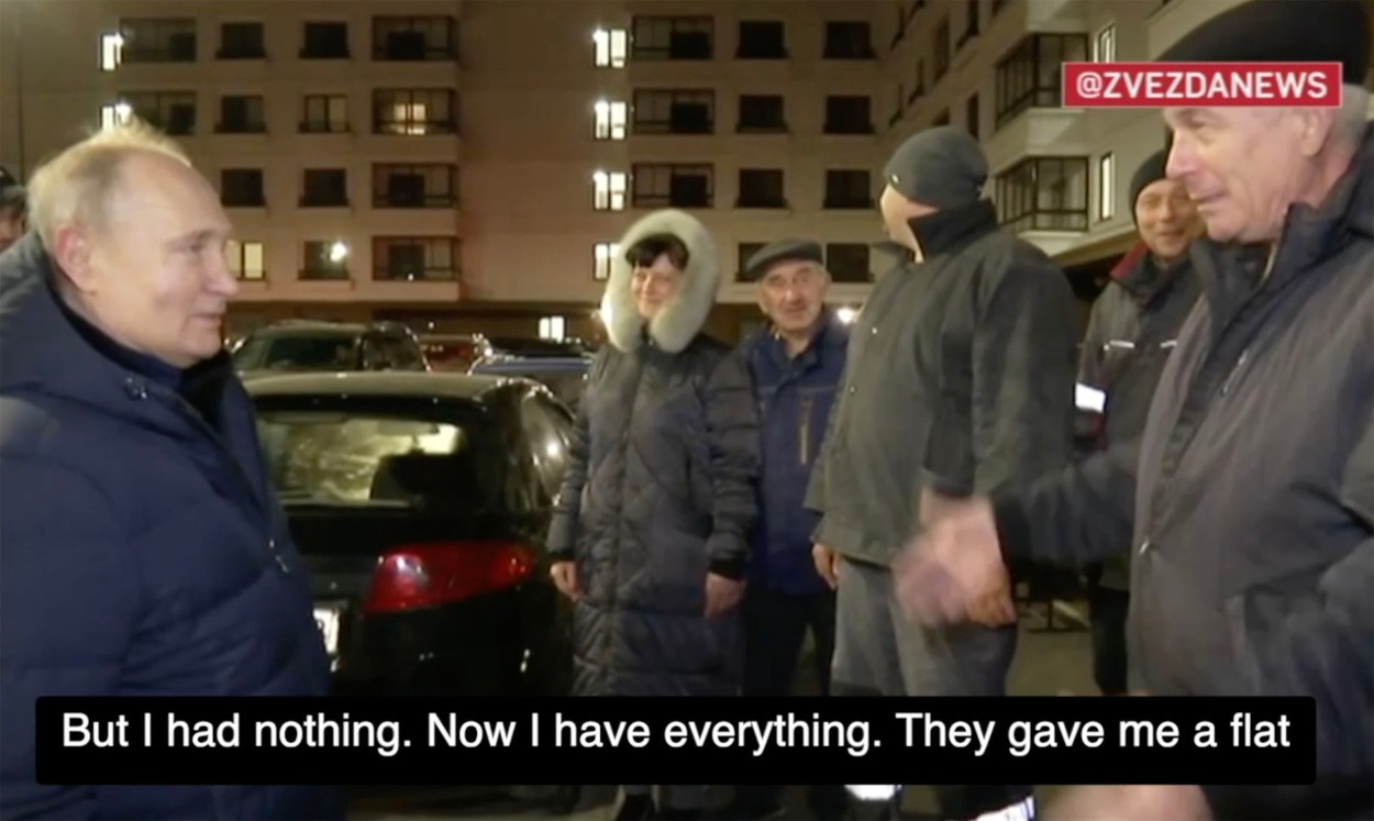Apoi, Putin a făcut un tur pietonal într-un complex rezidențial din cartierul Nevski, unde i s-au arătat planurile de reconstrucție. De asemenea, potrivit presei ruse, el a vorbit cu mai mulți rezidenți și chiar a vizitat un apartament.