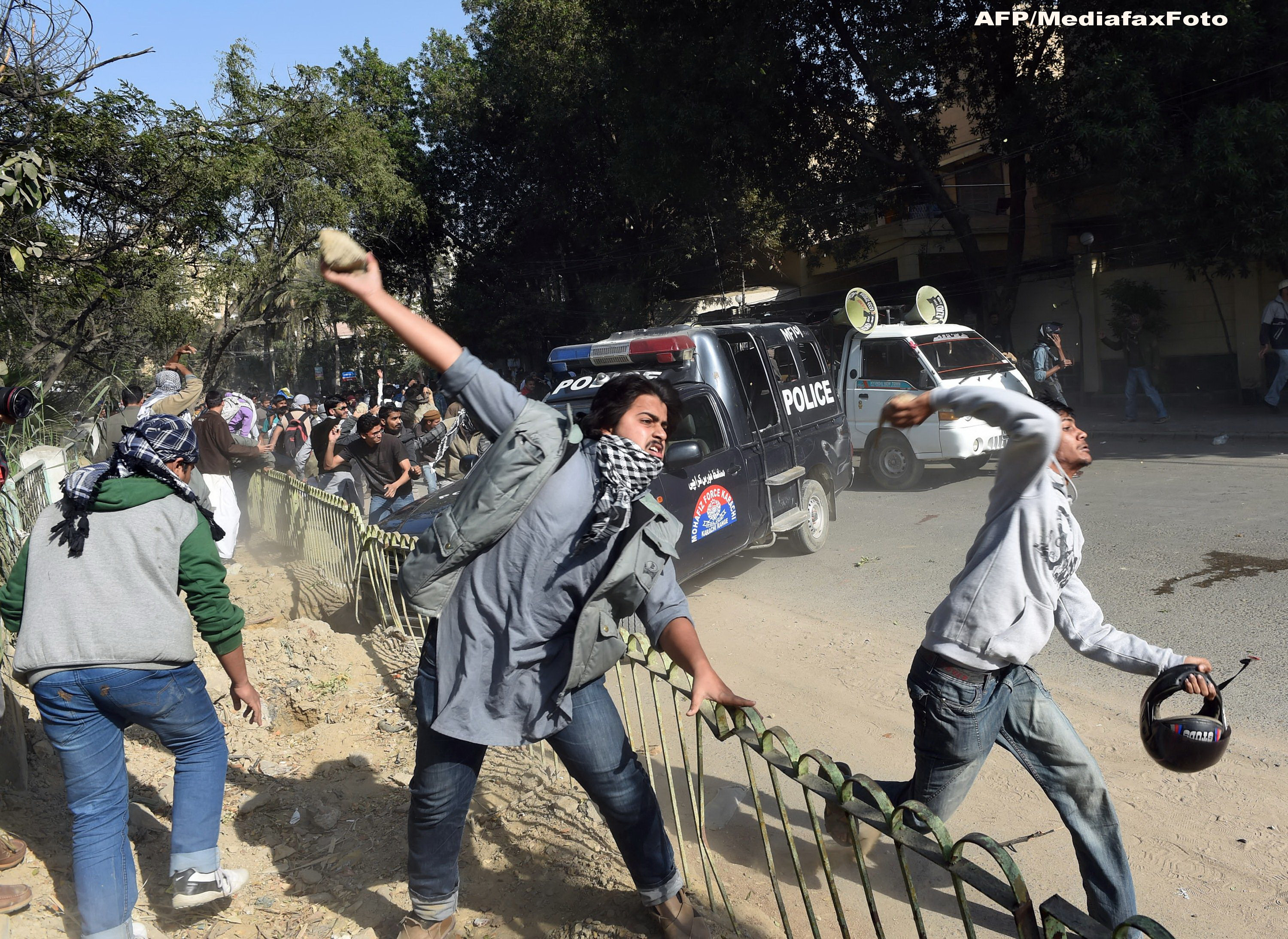In schimb, in Pakistan mii de manifestanti au denuntat vineri publicarea unei noi caricaturi cu Mahomed de catre Charlie Hebdo, miscarea de contestare transformandu-se intr-o infruntare in fata Consulatului francez de la Karachi, unde un jurnalist AFP a fost grav ranit prin impuscare. Pakistanul, a doua cea mai populata tara musulmana din lume (200 de milioane de locuitori), a condamnat saptamana trecuta atacul sangeros de la saptamanalul satiric francez.