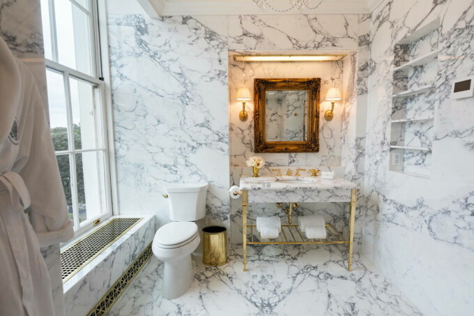 Președintele-magnat imobiliar, mare adept al marmurei și aurului, a înlocuit gresia verde din anii '40 cu marmură albă și neagră lustruită, în baia pe care a modificat-o.