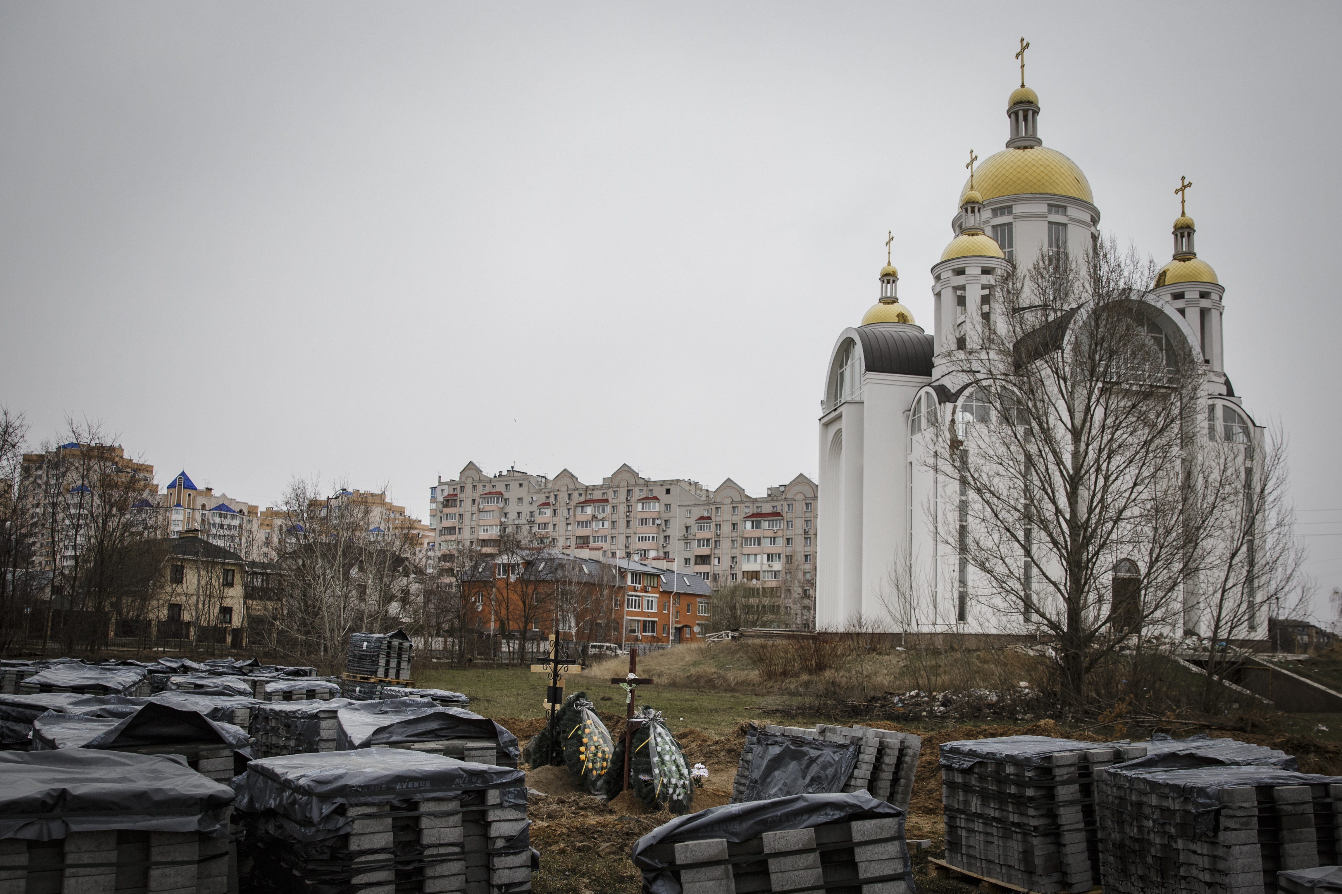 Morga din Bucea era arhiplină, pe măsură ce numărul deceselor creștea în martie. Pentru a face față tuturor cadavrelor, a fost adus un tractor pentru a săpa o groapă comună în incinta Bisericii Sfântul Andrei și Piervozvannoho All Saints, a declarat starețul acesteia, Andrii Galavin, pentru CNN.