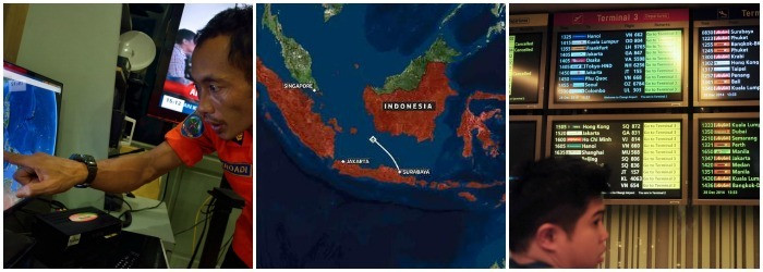 Armata indoneziana a trimis 2 avioane sa caute aeronava disparuta, intr-o regiune situata intre Insula Belitung si Kalimantan, pe coasta de vest a Insulei Borneo.La bord se aflau 156 de indonezieni, trei sud-coreeni, un britanic, un malaysian si un singaporez. De asemenea, copilotul era francez. Printre pasageri se numarau 16 copii si chiar un bebelus. In aeroporturile din Singapoare si Surabaya au fost activate celule de criza.