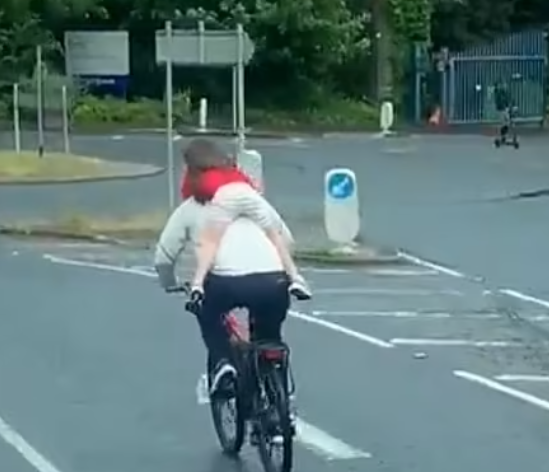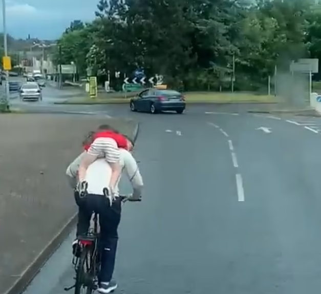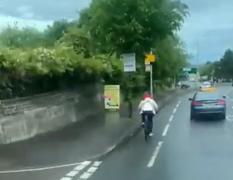 Un videoclip șocant a stârnit indignare în Irlanda de Nord după ce un bărbat a fost filmat mergând pe bicicletă pe un drum din Belfast, având un copil care îi ținea de gât, circulând apoi în sensul greșit printr-un sens giratoriu.