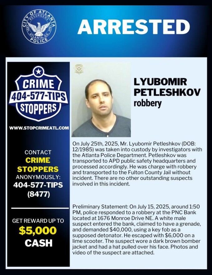 Suspectul, identificat drept Lyubomir Petleshkov, în vârstă de 39 de ani, a fost arestat la zece zile după ce ar fi comis jaful la o sucursală PNC Bank de pe Monroe Drive, scrie Novinite. Incidentul a avut loc pe 15 iulie, cu puțin înainte de ora 14:00, ora locală.