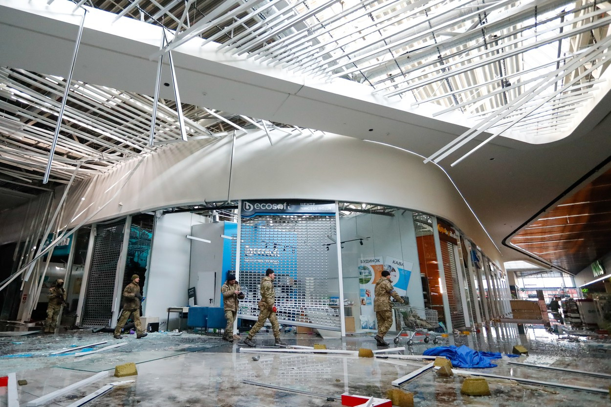 În cursul nopţii, echipele de salvare au transmis că "tiruri inamice" au provocat un incendiu pe mai multe etaje ale centrului comercial, situat în cartierul Podilski.