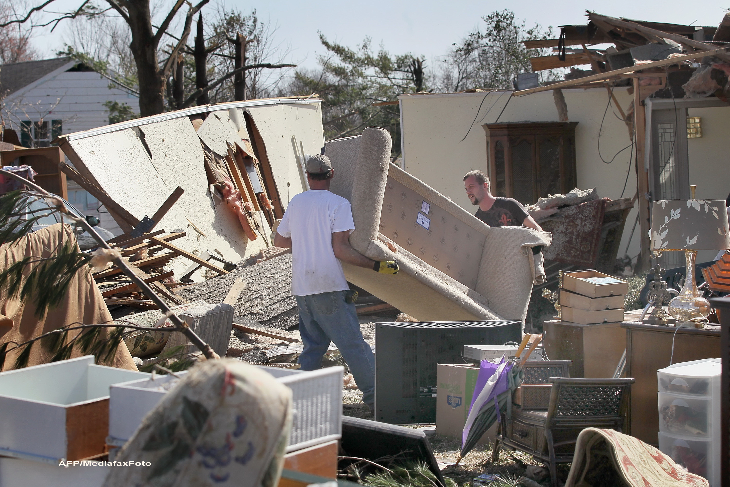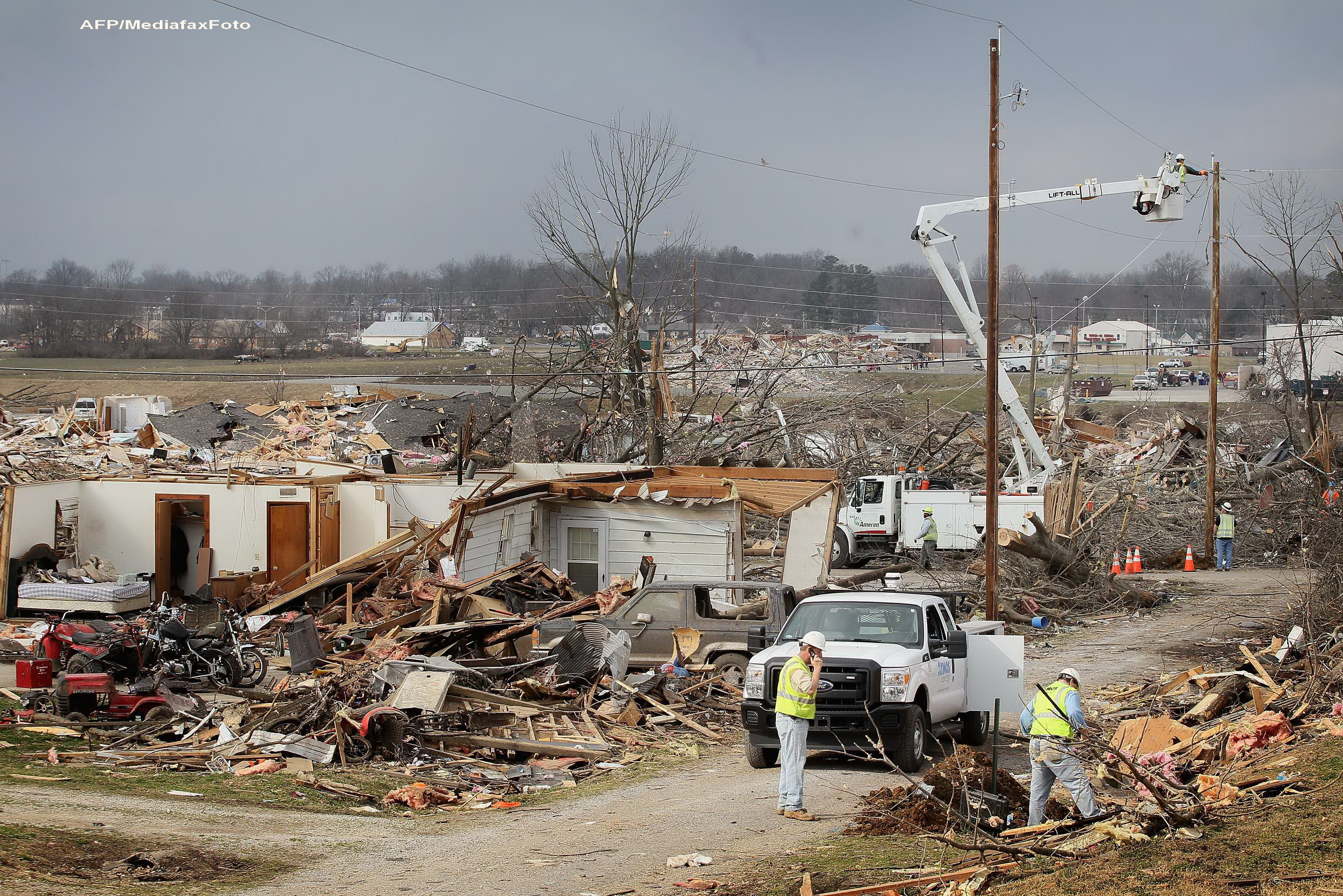 Casele au fost reduse la gramezi de moloz, masinile aruncate in lacuri, arborii dezradacinati si magazinele transformate in ruine pe o arie extinsa din Nebraska pana in Kentucky, din cauza vanturilor foarte puternice. Orasul Harrisburg, din Illinois, a fost de asemenea distrus de o tornada de intensitate rara miercuri, in timp ce localnicii dormeau.