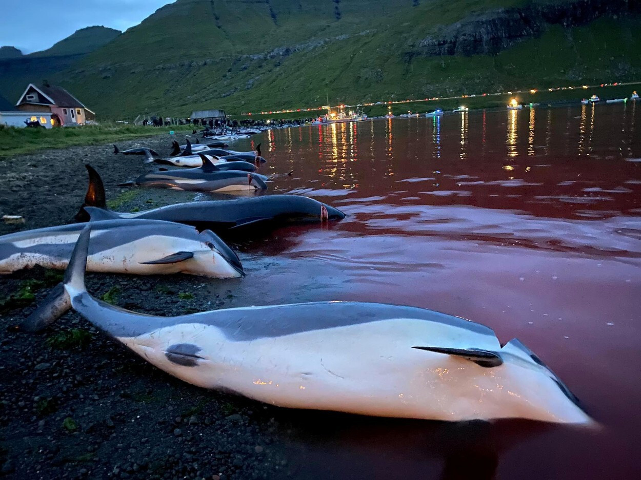 Delfinii uciși au fost aduși pe uscat, iar plajele au fost împânzite de cadavre. Imaginile făcute publice arată apele înroșite de sângele mamiferelor ucise, în timp ce oamenii privesc, înmărmuriți, de pe plajă.