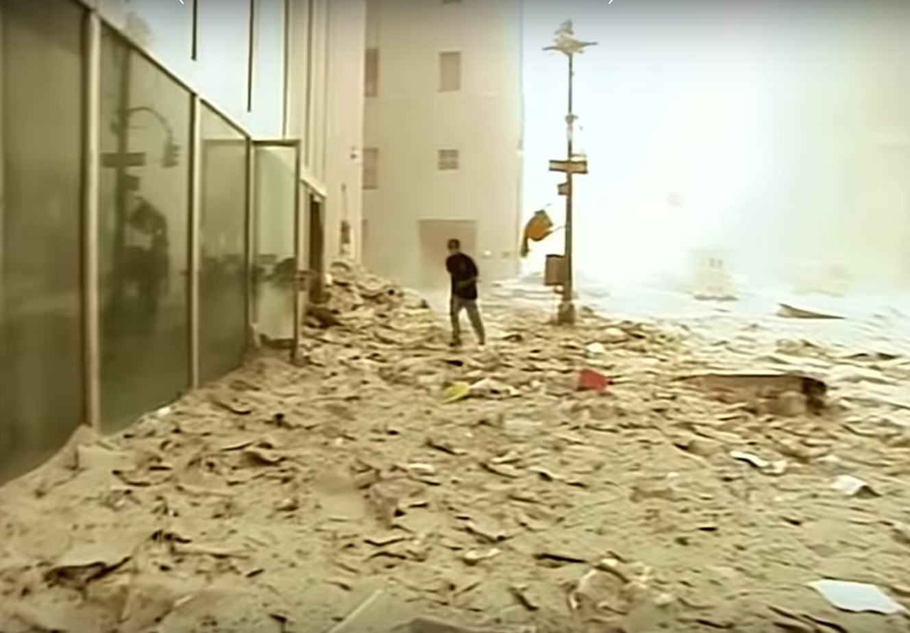 Mulțimea privește tăcută, cu o teamă de neînțeles, cum al doilea avion se izbește de turn și explodează, apoi toată lumea începe să țipe deodată.