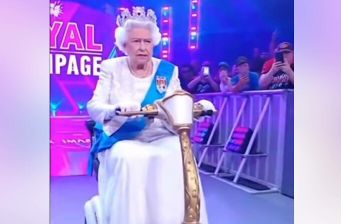 Într-un videoclip de pe platforma TikTok vizionat de AFP, regina Elisabeta a II-a, purtând un colier de perle şi coroană, ajunge la un meci de wrestling pe scuter, sare peste corzi şi se năpusteşte asupra unui luptător. Într-un alt videoclip postat pe Facebook, regina promovează sufleuri cu brânză într-un supermarket, în timp ce în alt videoclip apare jucând fotbal.