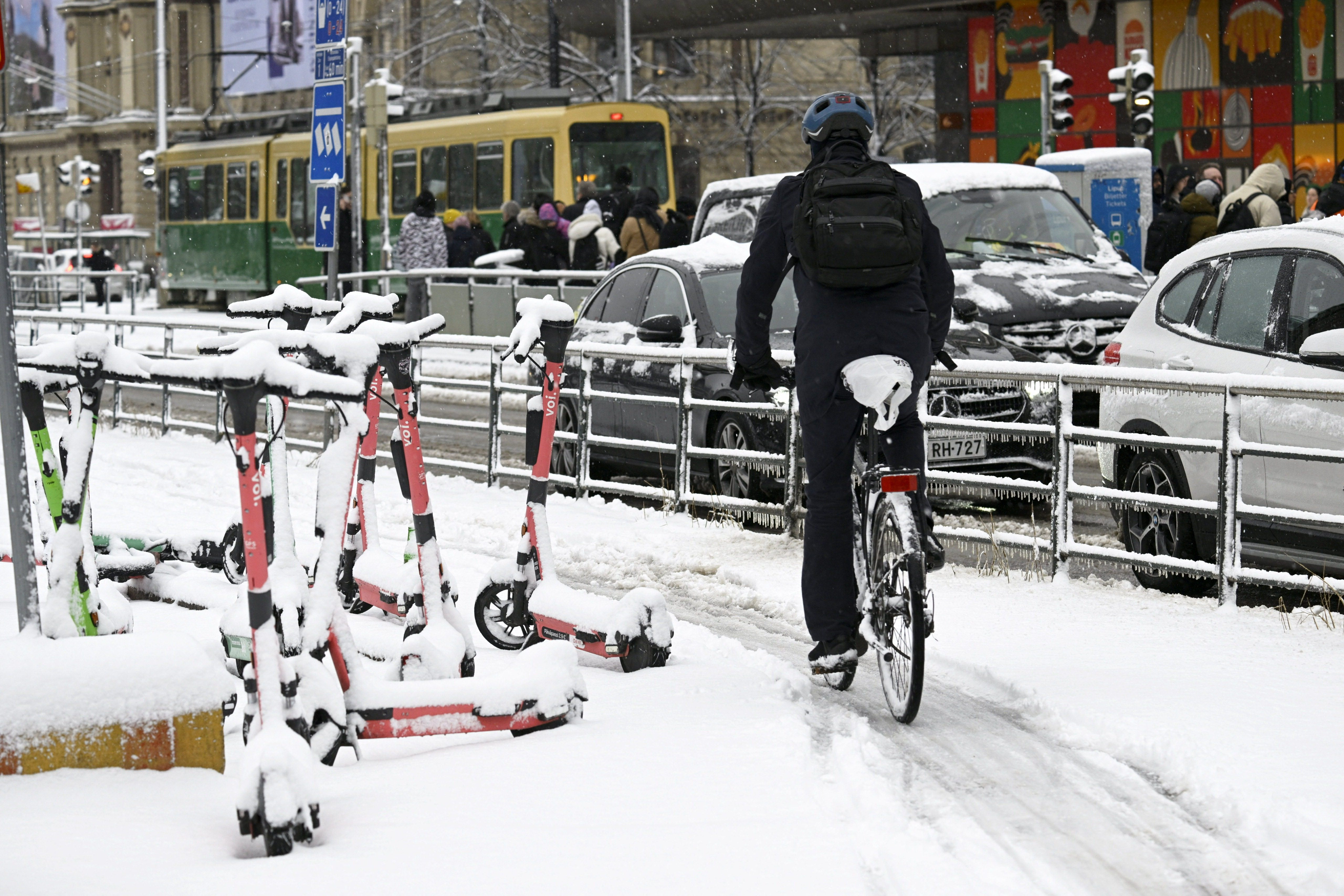 Imaginile i-au arătat pe locuitorii din Helsinki mergând prin zăpadă şi gheaţă, cu umbrele care să-i apere de ninsori abundente, în timp ce pe trotuare, printre maşini şi scutere, se formaseră troiene.