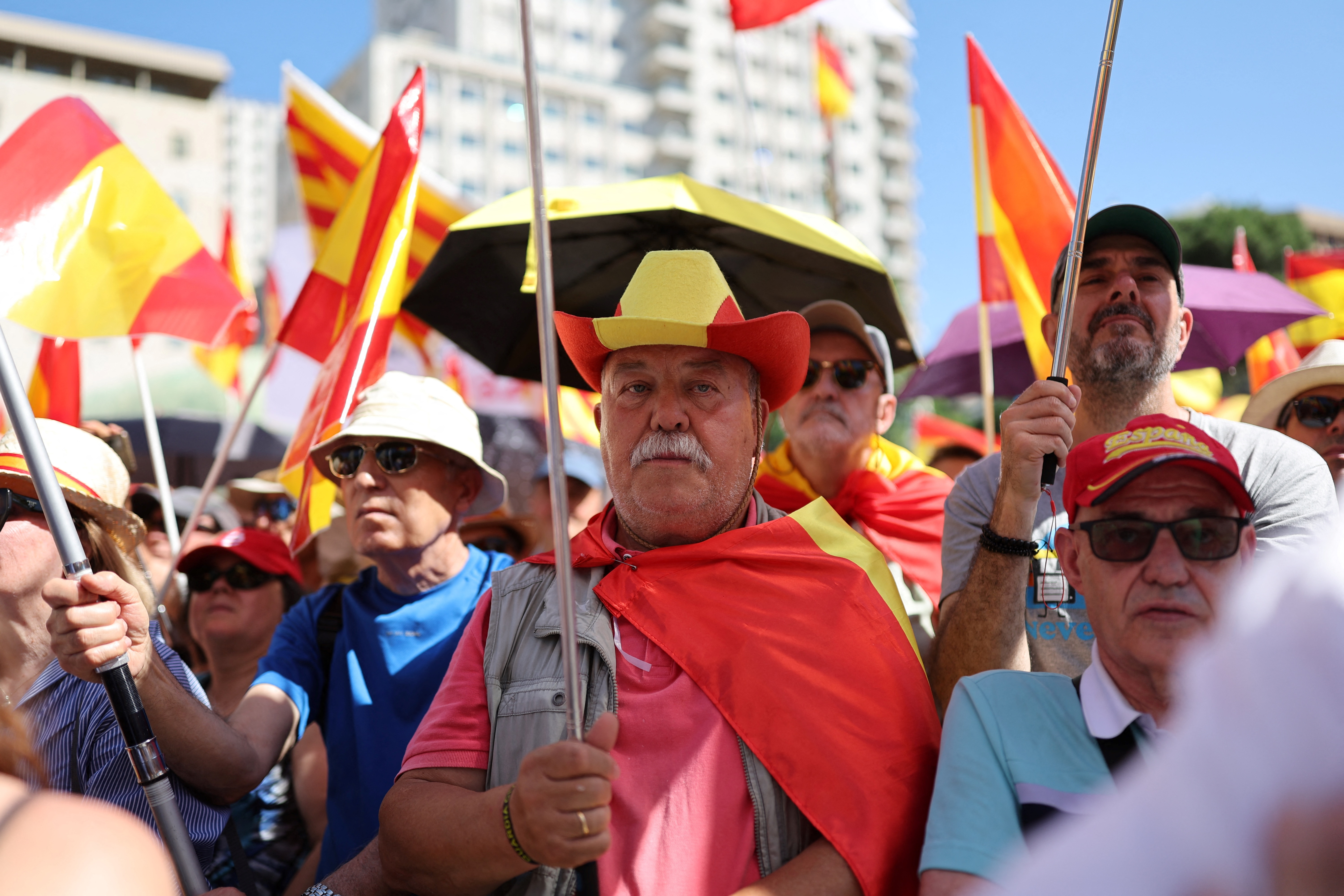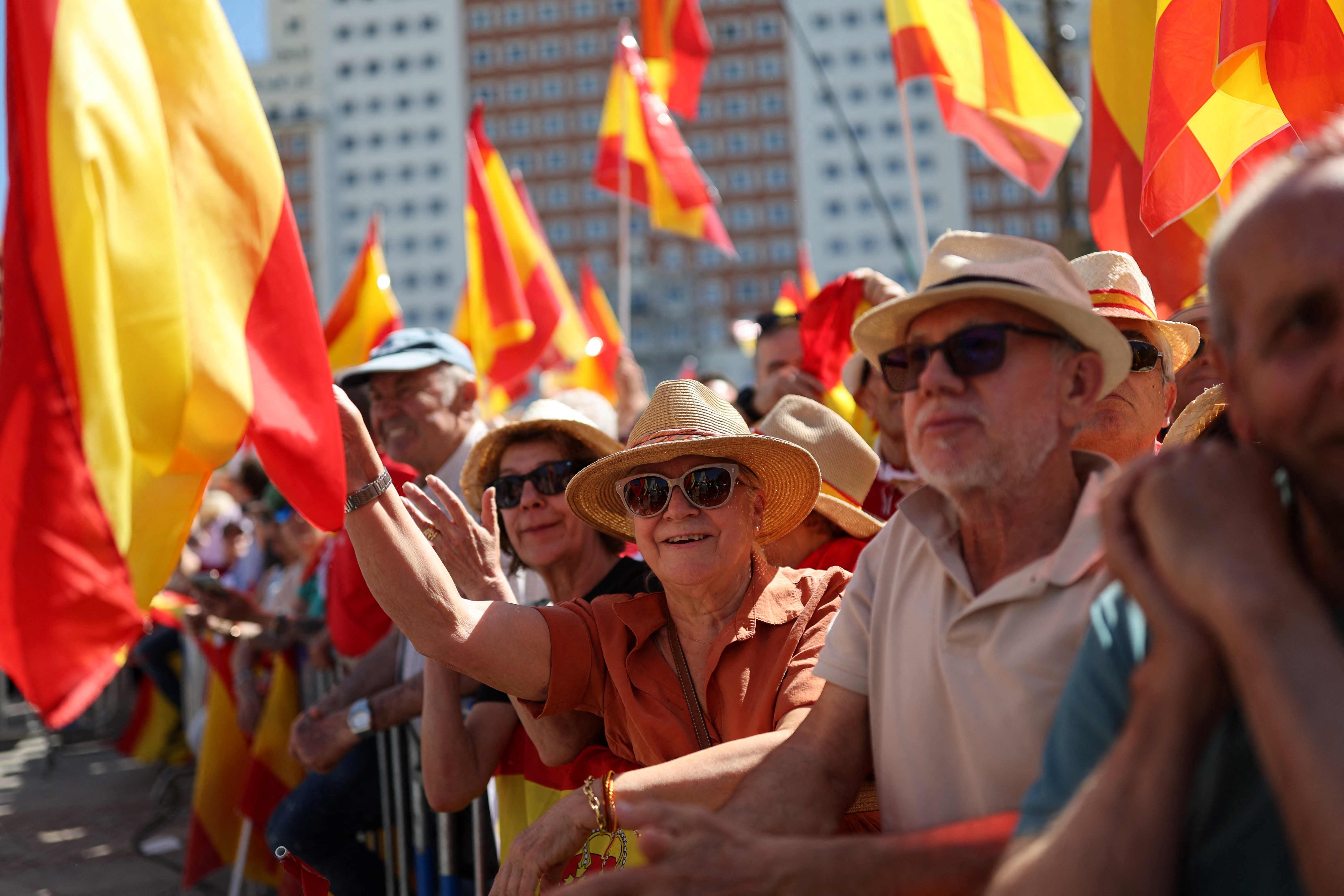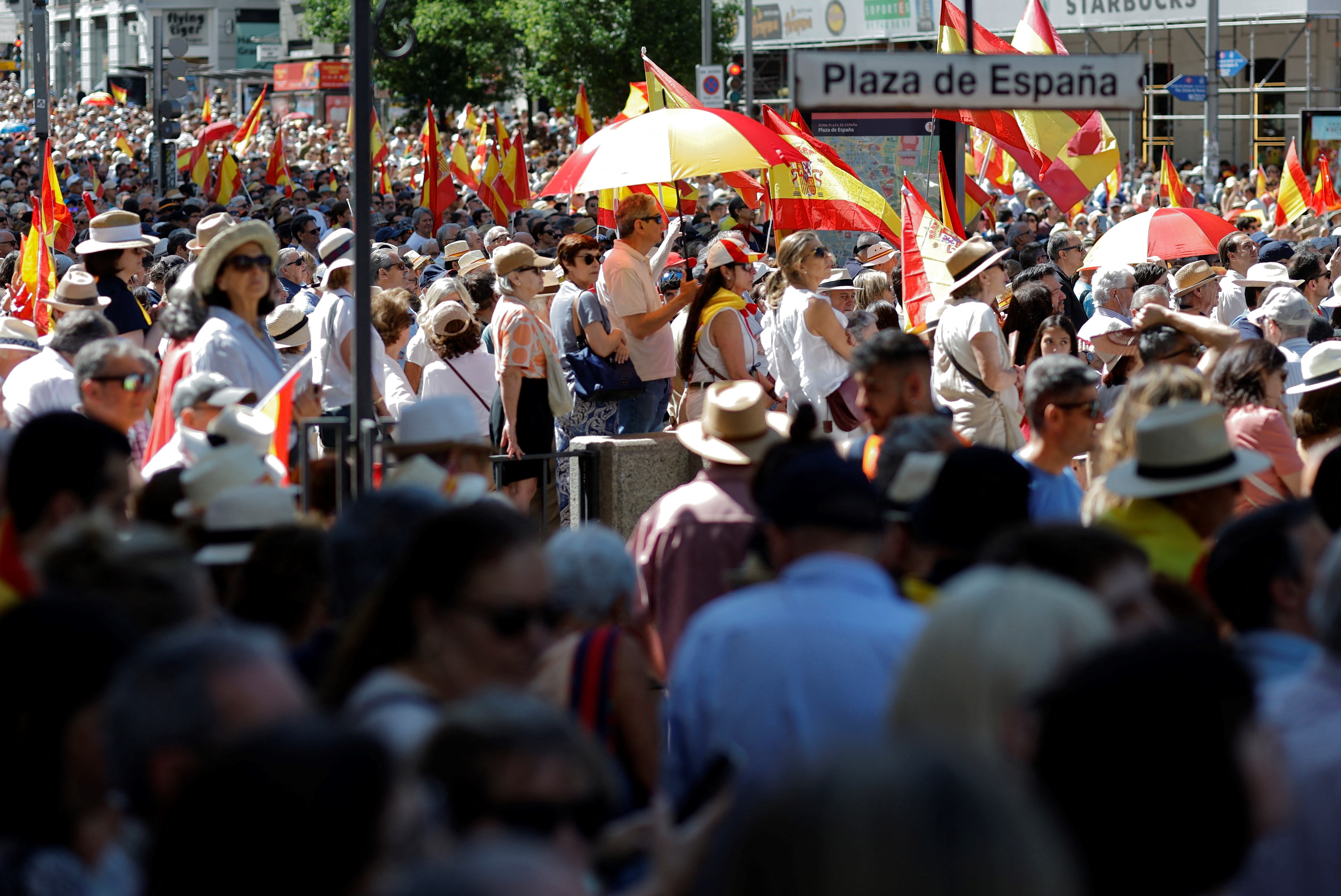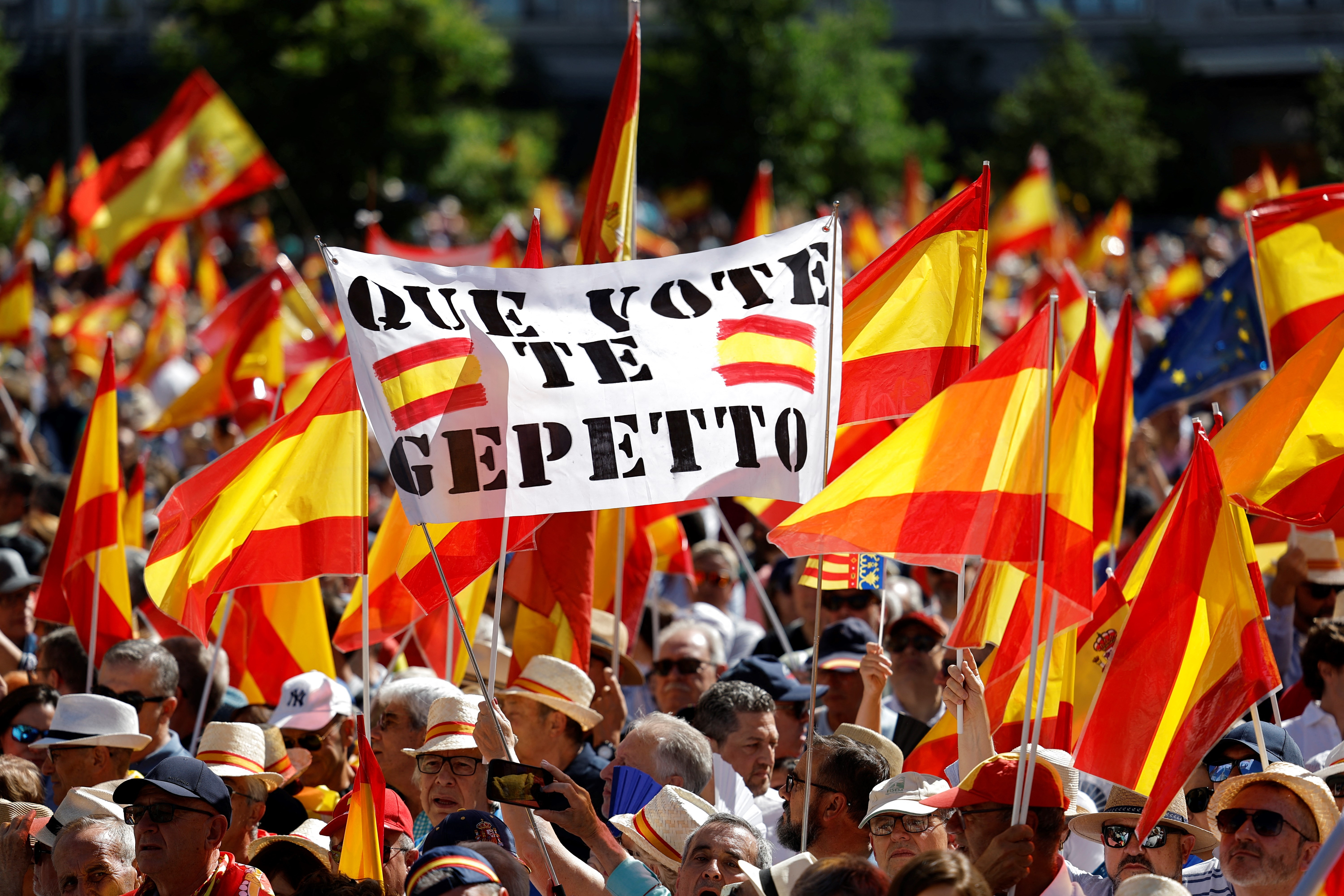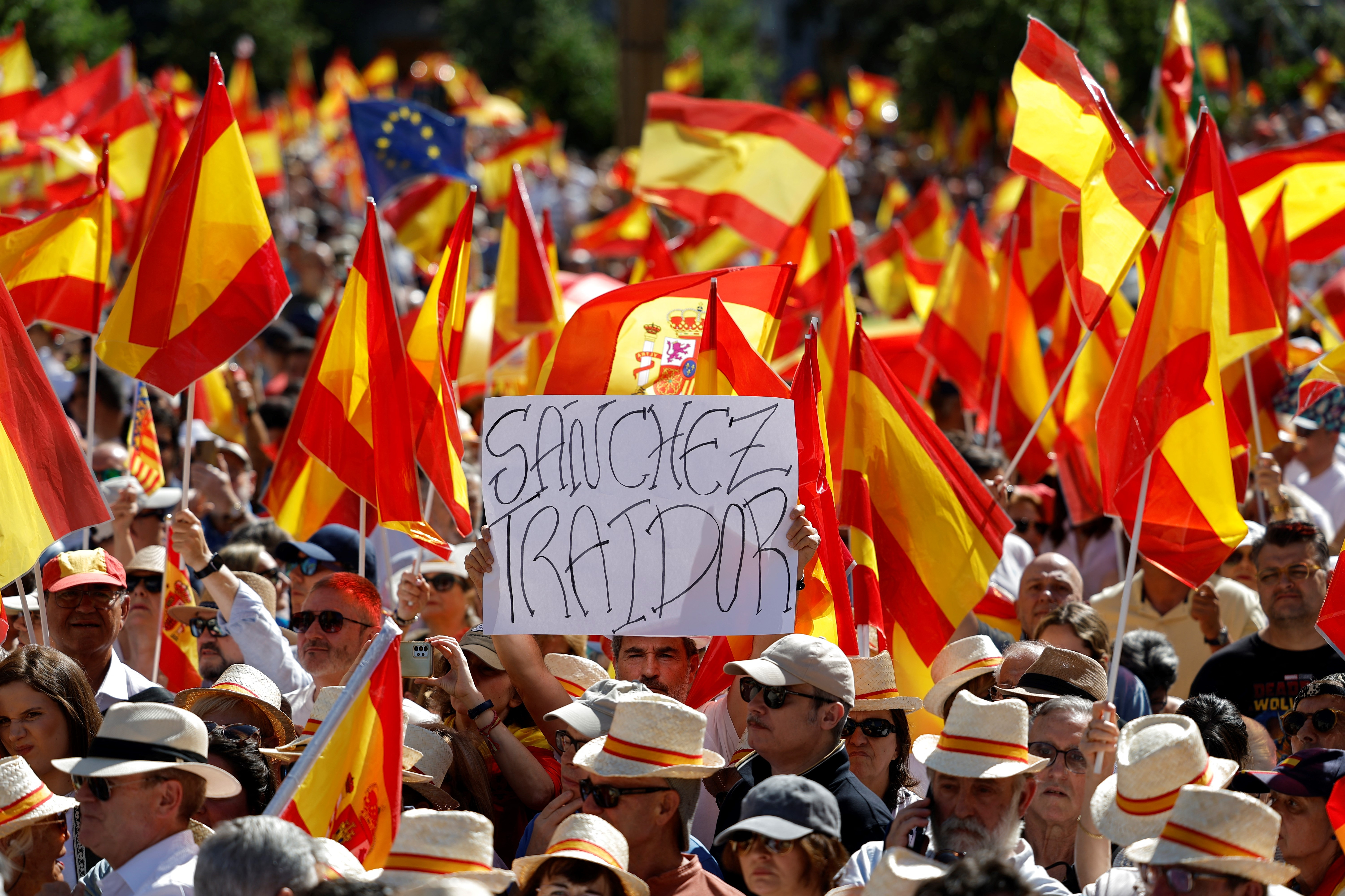 Manifestanţii, mulţi fluturând steaguri spaniole, s-au adunat în Plaza de España din centrul capitalei şi au scandat „Pedro Sanchez, demisia”, denunţând guvernul.