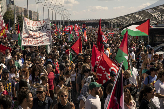 La Roma, potrivit prefecturii, peste 20.000 de persoane, între care numeroşi liceeni, s-au adunat în faţa gării Termini, fluturând steaguri palestiniene şi strigând "Palestina liberă!".