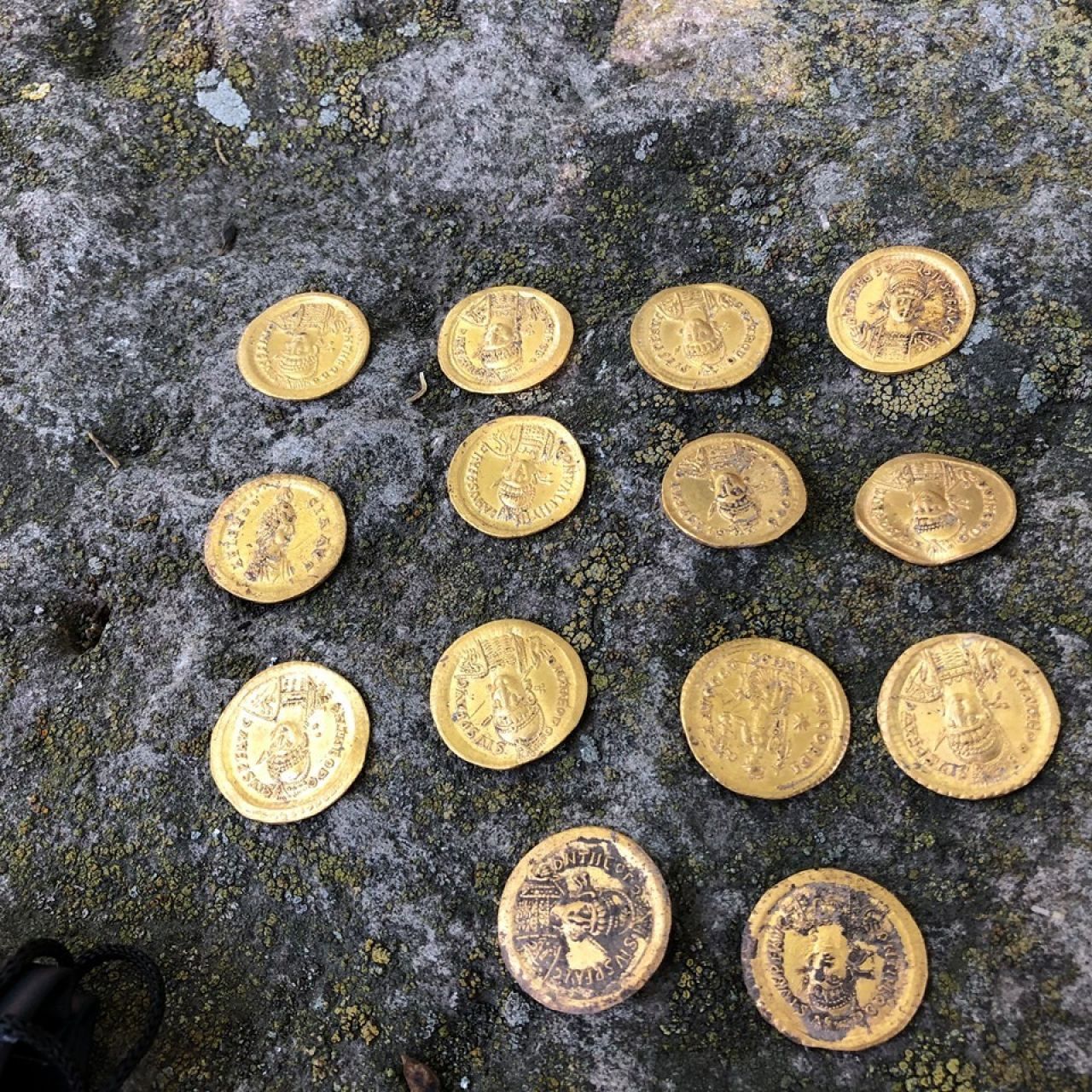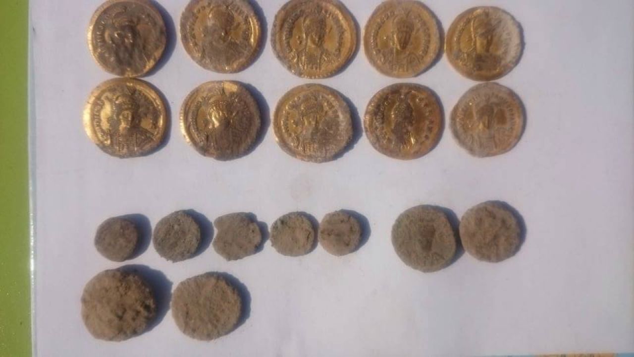 Deocamdată au fost localizate 16 monede din aur - 14 cu efigia împăratului Teodosie al II-lea, una care o reprezintă pe soţia sa, Aelia Eudoxia, şi o alta care îl reprezintă pe împăratul Valentinian al III-lea.
