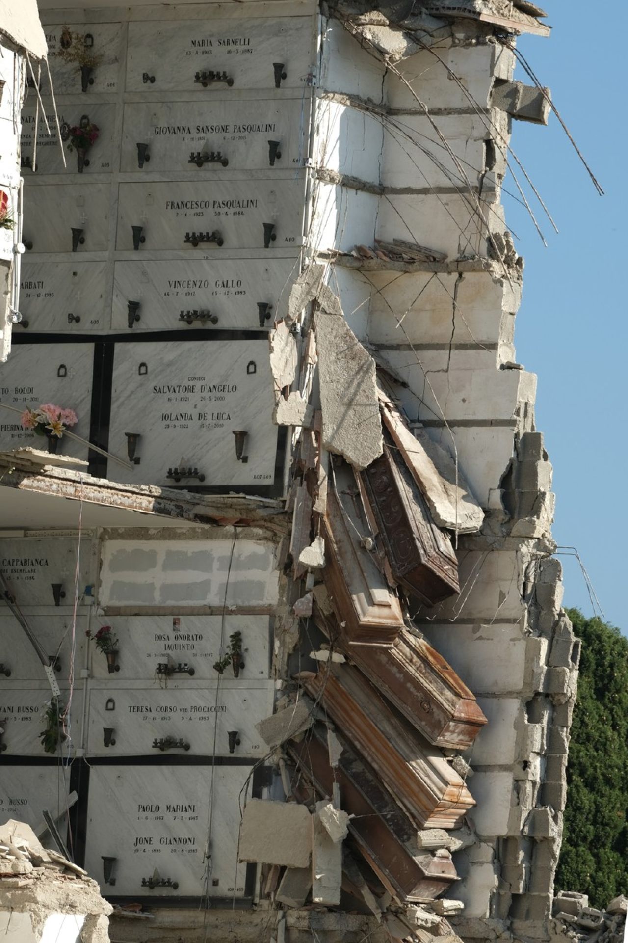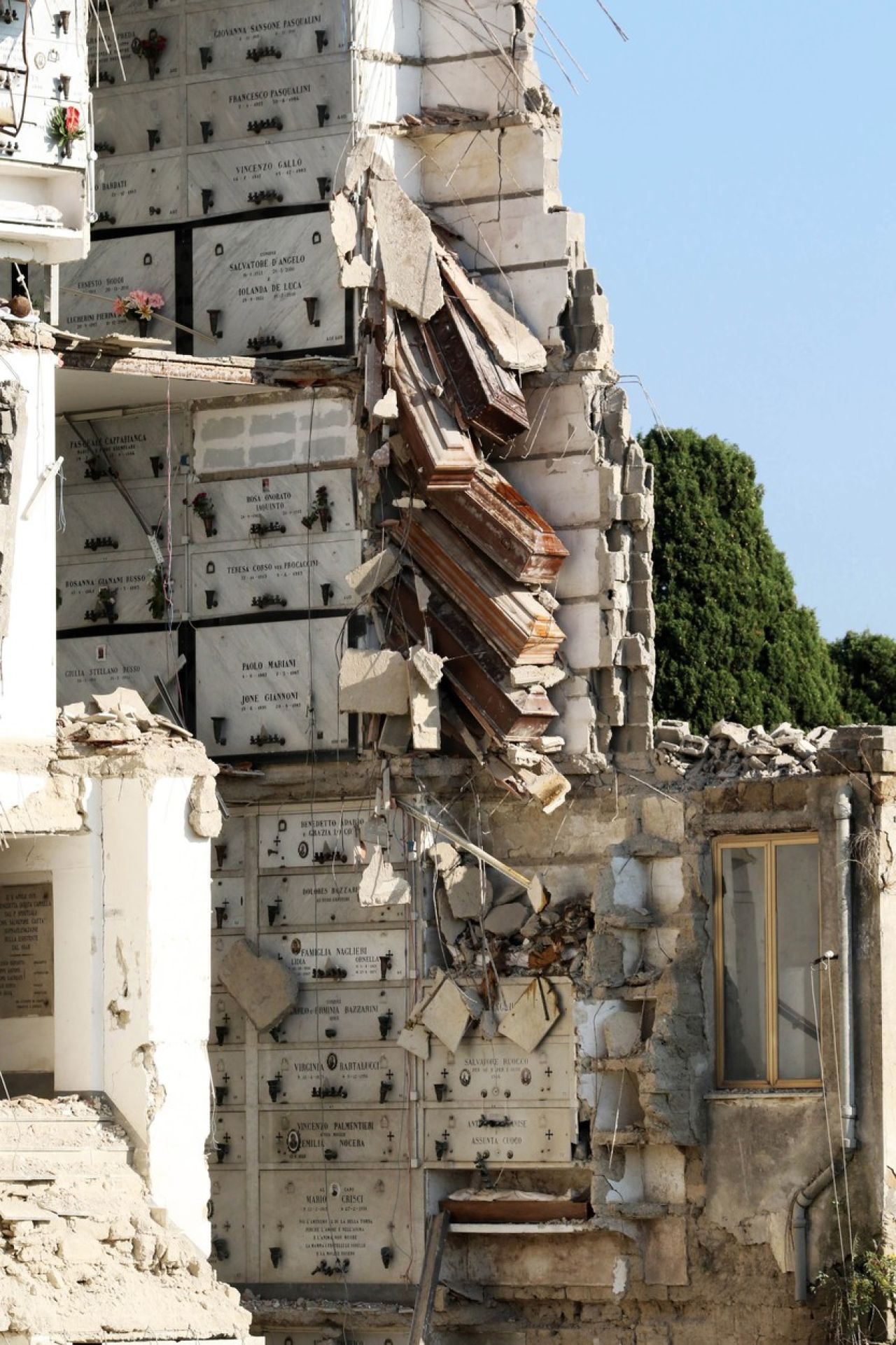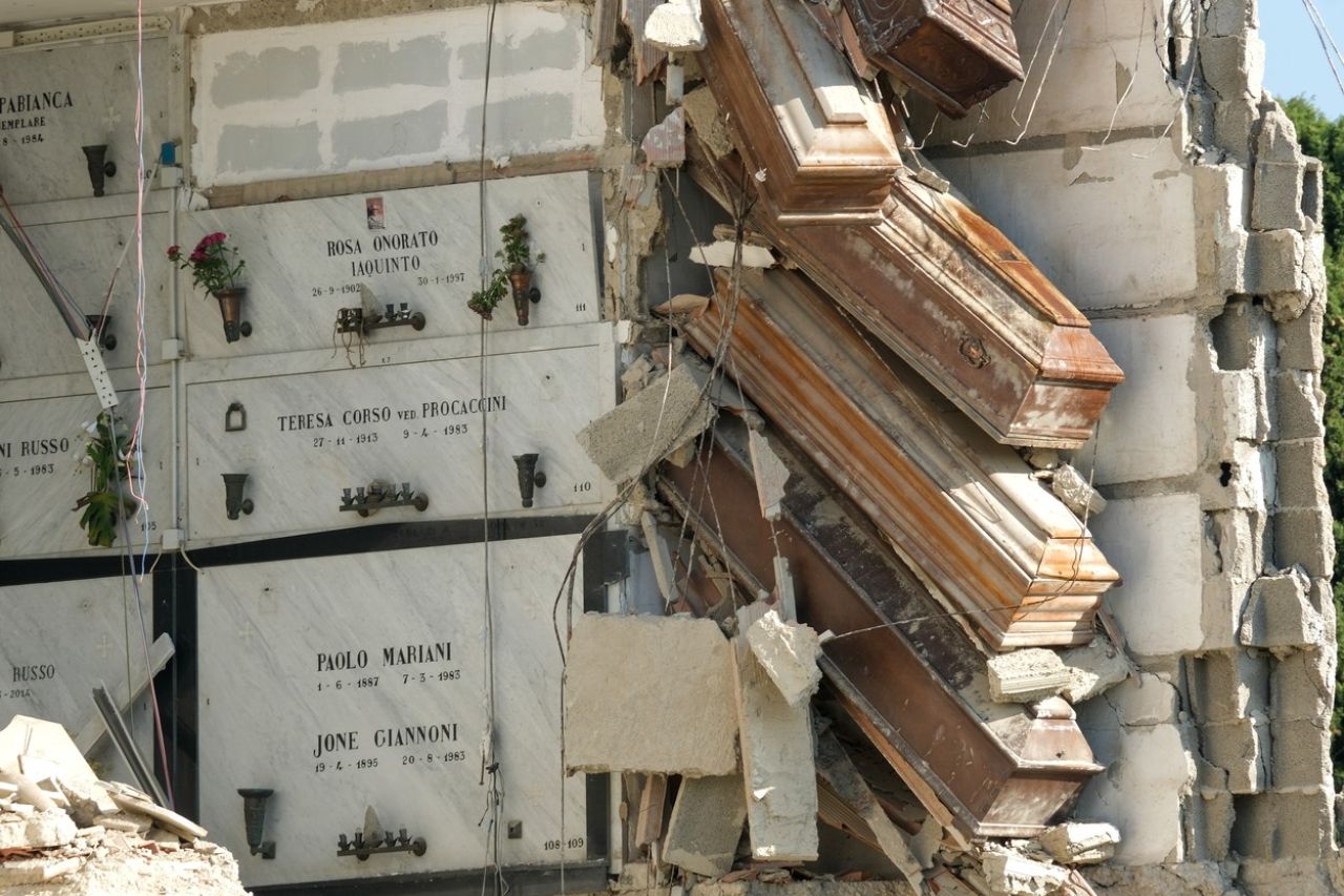 Zeci de sicrie, suspendate în aer după ce o clădire dintr-un cimitir din Italia s-a prăbușit | GALERIE FOTO