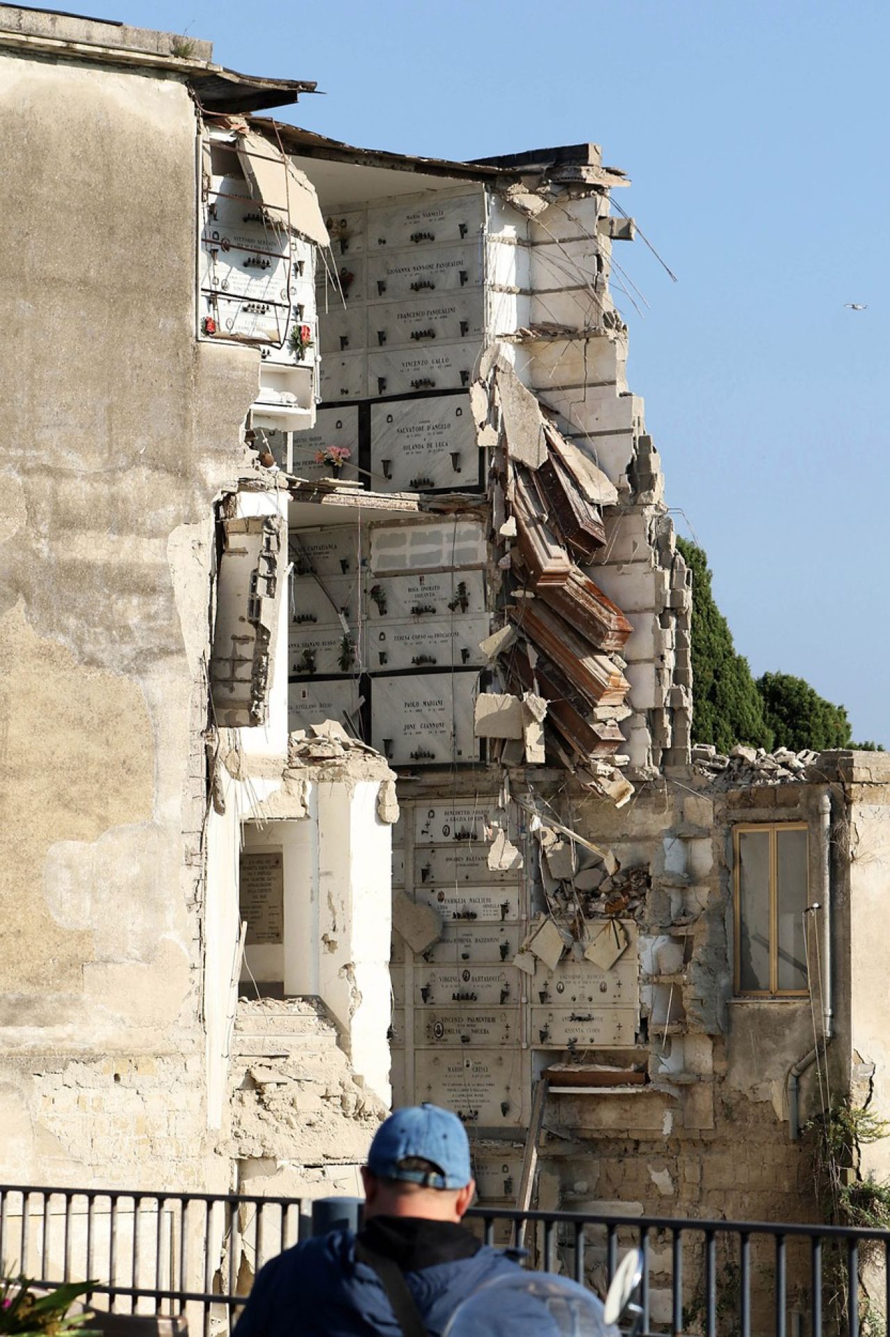 Zeci de sicrie au rămas suspendate în aer după prăbușirea unei clădiri de patru etaje, care conținea nișe funerare, la cel mai vechi cimitir din Napoli.