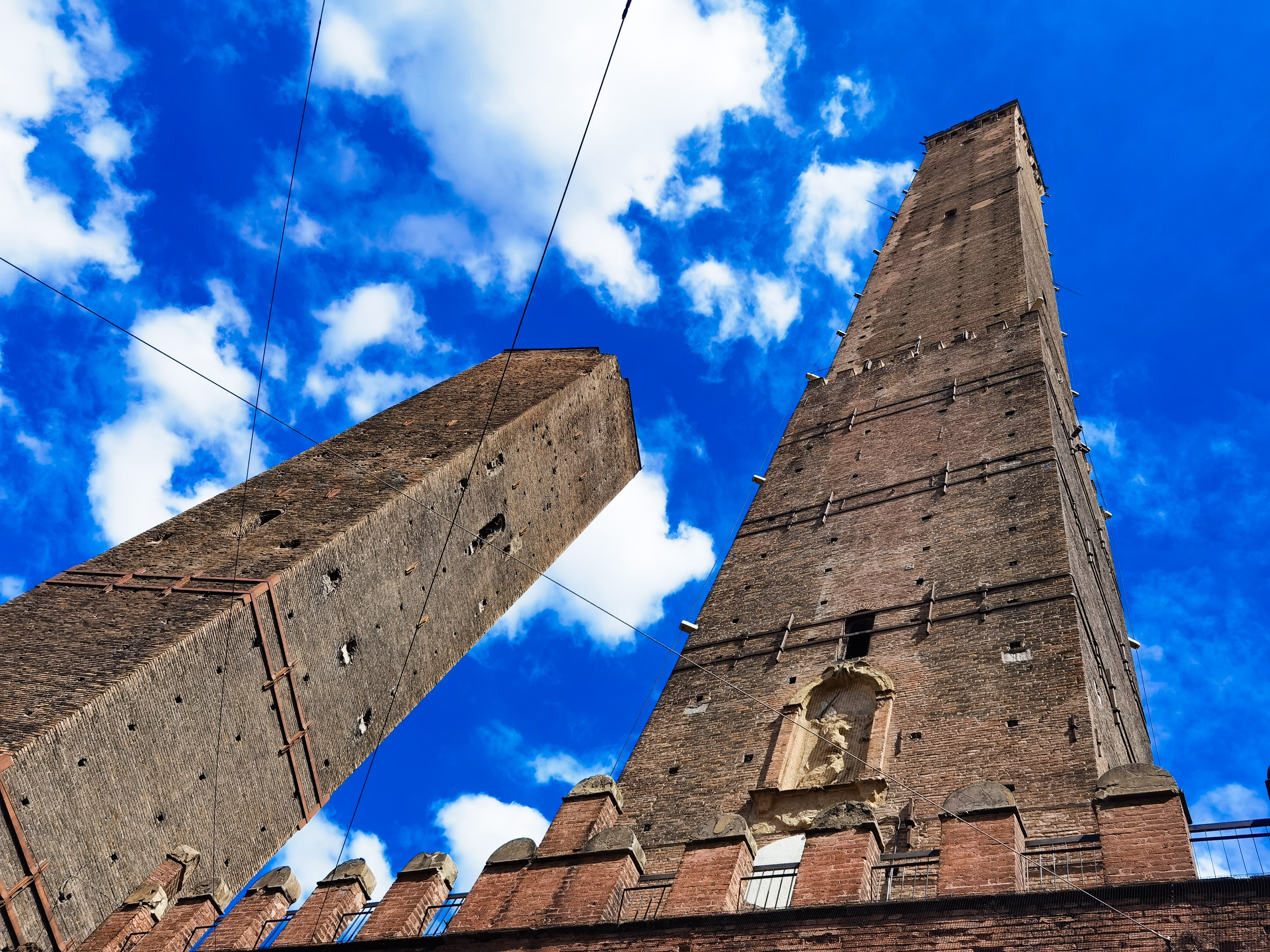 Turnurile Garisenda și Asinelli poartă numele familiilor rivale care le-au construit, despre care se crede că au fost realizate pentru a se întrece în privința puterii și bogăției, și sunt situate unde era intrarea în oraș.