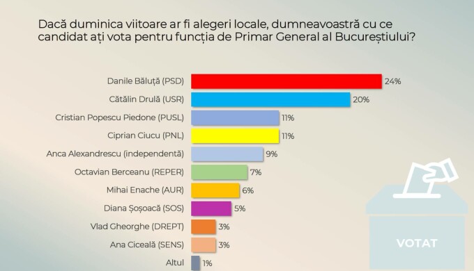 Pe primul loc s-au clasat Daniel Băluţă (PSD) şi Ciprian Ciucu (PNL) cu câte 25% din voturi, urmaţi de Cătălin Drulă (USR), cu 20%, Anca Alexandrescu (independentă), cu 18%, Vlad Gheorghe (DREPT), cu 5%, Ana Ciceală (SENS), cu 2% şi Octavian Berceanu (independent) - 2%.