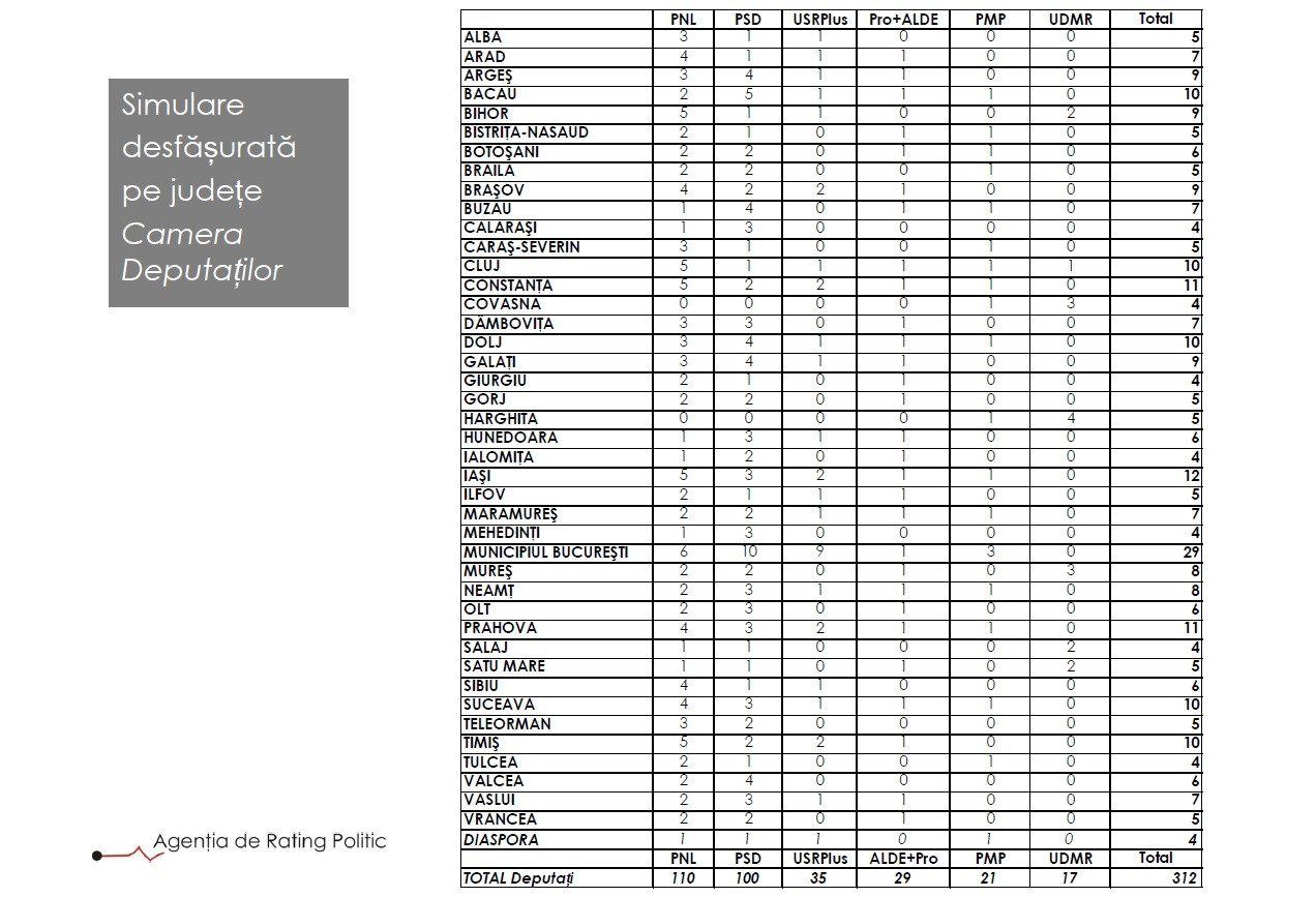 Agenția de Rating Politic explică faptul că scorurile partidelor care au candidat în alianțe în unele județe (ex. PNL+USR, PSD+ALDE+ProRomânia) au fost estimate și calculate separat după un model propriu.