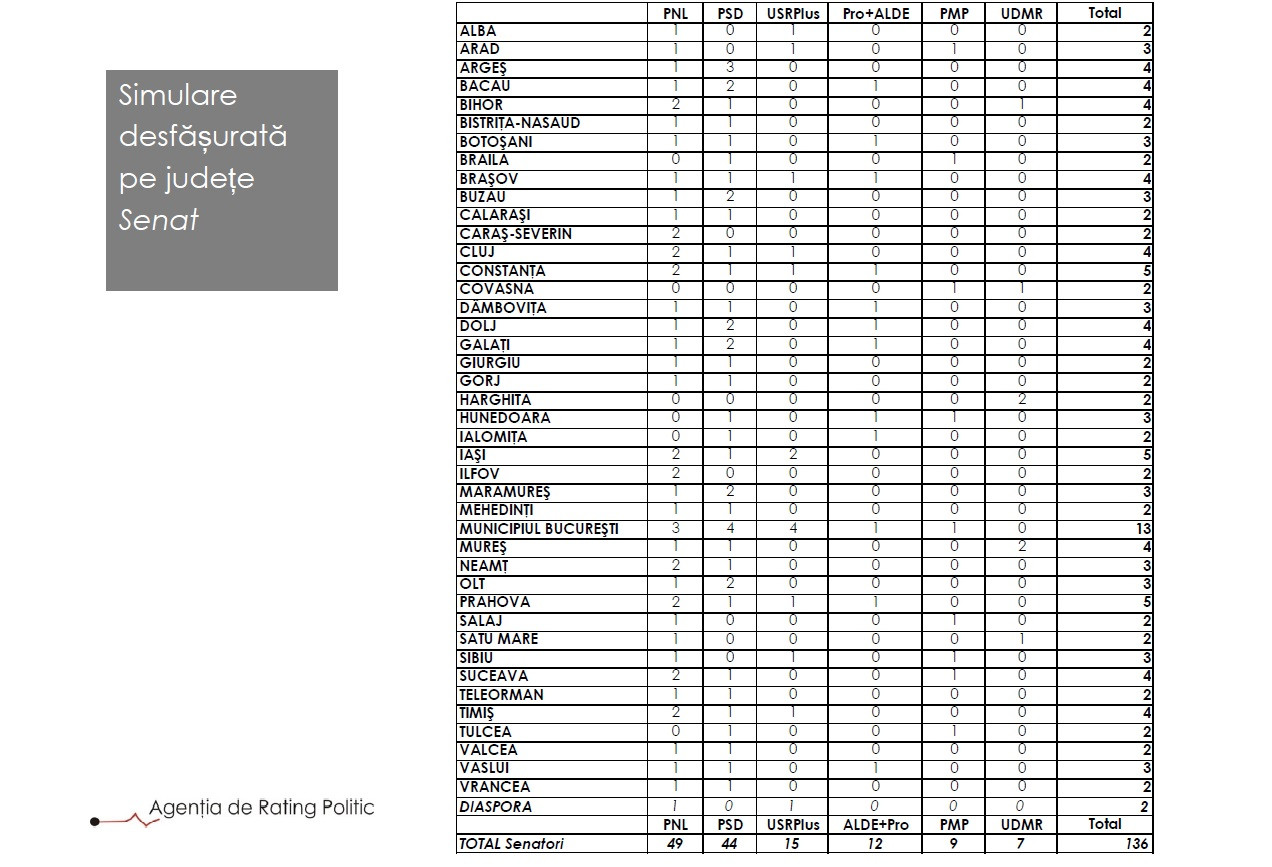 Deși în prezent PSD are cele mai multe fotolii parlamentari, situația ar urma să se schimbe după viitoarele alegeri, potrivit unei simulări electorale realizate de Agenția de Rating Politic, în baza rezultatelor de la alegerile locale din 27 septembrie 2020: Consiliul Județean + Consiliul General al Municipiului București.