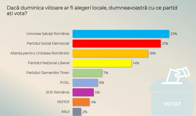În ceea ce priveşte votul pentru Consiliul General, pe primul loc se află USR - 23%, urmat de PSD - 21%, AUR - 18%, PNL - 14%, POT - 7%, PUSL - 6%, sos rOMÂNIA - 5%, REPER - 4%,