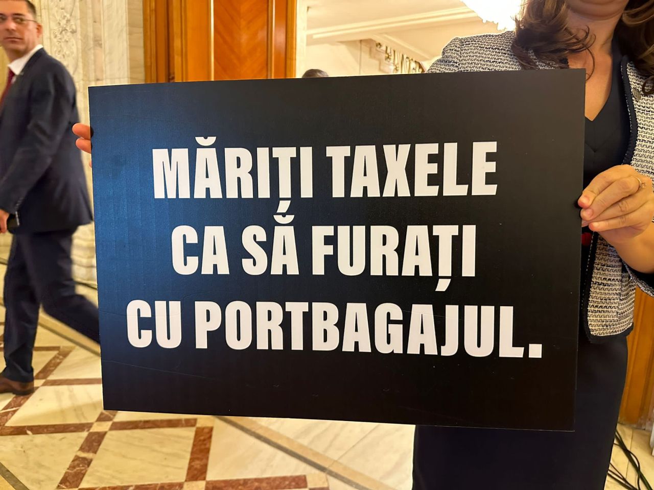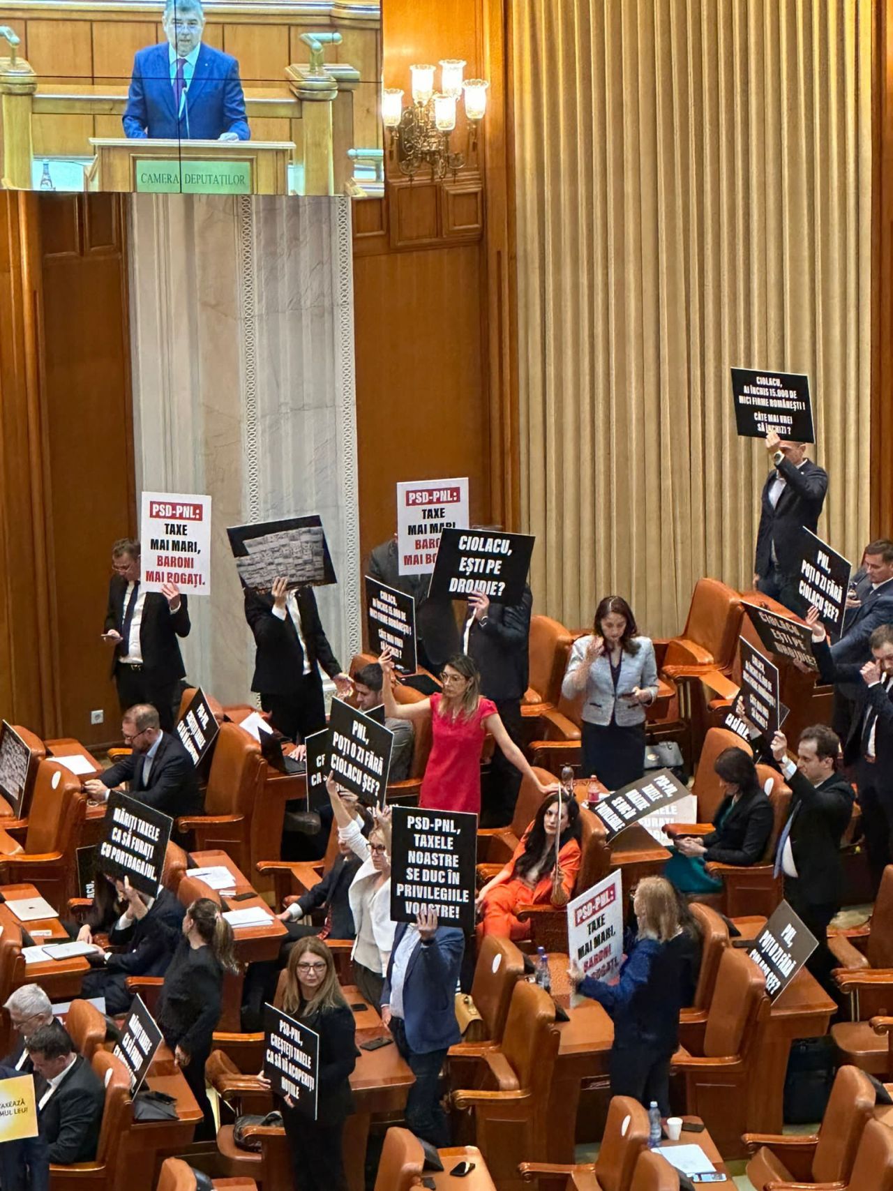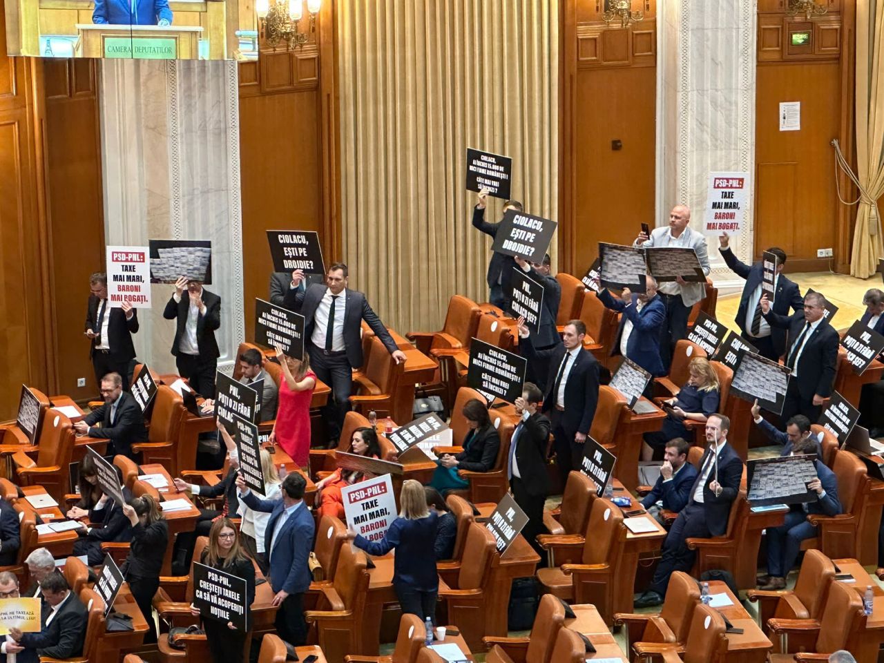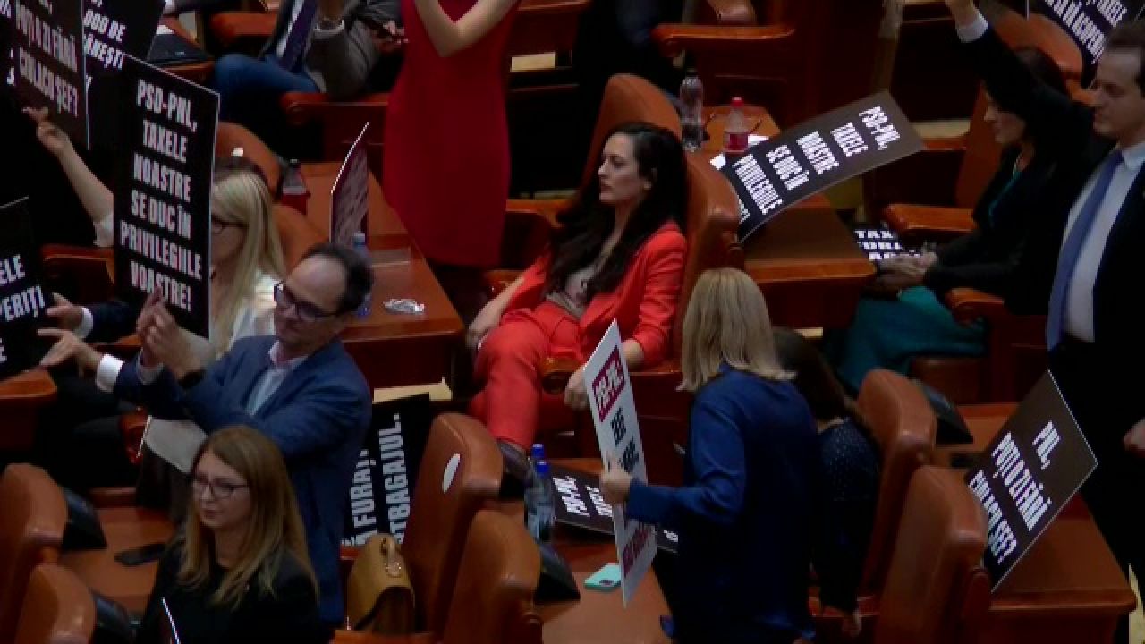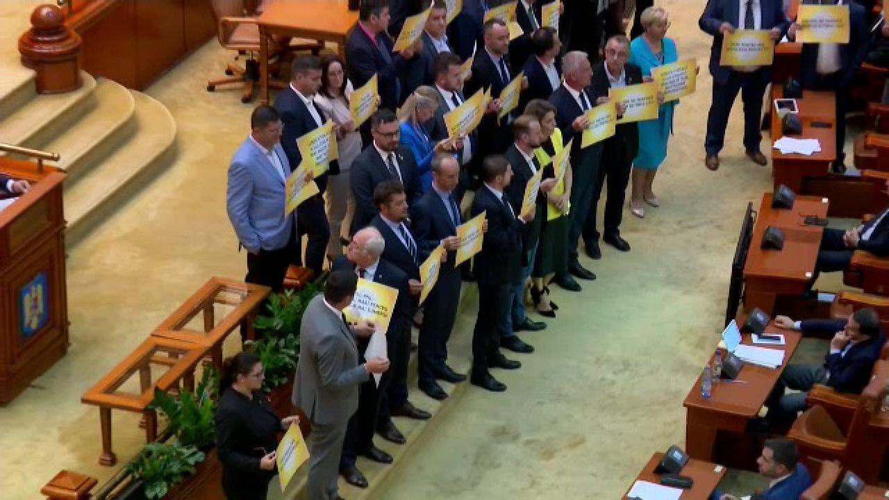 ora 18.15 Parlamentarii USR au venit pregătiți cu bannere de protest în plenul Parlamentului.