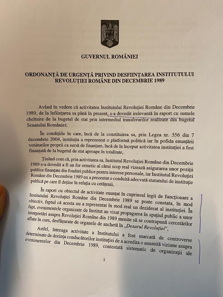„Activitatea Institutului Revoluției Române din Decembrie 1989 de la înfințarea sa până în prezent, s-a dovedit irelevantă în raport cu sumele cheltuite de la bugetul de stat prin intermediul transferurilor realizate din bugetul Senatului României”, se arată în documentul adoptat de Guvern.