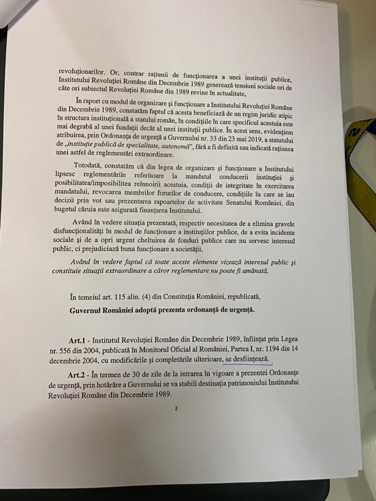 Secretarul general al Guvernului, Antonel Tănase, a propus, la începutul şedinţei, introducerea pe ordinea de zi a proiectului de OUG pentru desfiinţarea Institutului Revoluţiei Române din Decembrie 1989, condus de fostul preşedinte Ion Iliescu.
