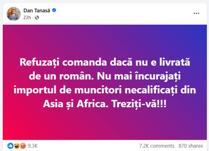 ”Refuzați comanda dacă nu e livrată de un român. Nu mai încurajați importul de muncitori necalificați din Asia și Africa. Treziți-vă!!!”, a scris parlamentarul AUR.