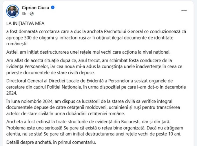 „LA INIŢIATIVA MEA a fost demarată cercetarea care a dus la ancheta Parchetului General, ce concluzionează că aproape 300 de oligarhi şi infractori ruşi ar fi obţinut ilegal documente de identitate româneşti! Astfel, am iniţiat destructurarea unei reţele mai vechi care acţiona la nivel naţional. Am aflat de această situaţie după ce, anul trecut, am schimbat fosta conducere de la Evidenţa Persoanelor, iar cea nouă mi-a adus la cunoştinţă unele inadvertenţe în ceea ce priveşte documentele de stare civilă depuse. Directorul General al Direcţiei Locale de Evidenţă a Persoanelor a sesizat organele de cercetare din cadrul Poliţiei Naţionale, în urma dispoziţiei pe care i-am dat-o în decembrie 2024. În luna noiembrie 2024, am dispus ca lucrătorii de la starea civilă să verifice integral documentele depuse de către cetăţenii moldoveni, ucraineni şi ruşi pentru transcrierea actelor de stare civilă în urma dobândirii cetăţeniei române. Ancheta a fost extinsă la toate structurile de evidenţă din Bucureşti, dar şi din ţară. Problema este una serioasă! Se pare că există o reţea bine organizată. Dacă nu atrăgeam atenţia, nu se ştia! Se pare că am iniţiat destructurarea unei reţele vechi de peste 10 ani", spune Ciucu în postarea de pe Facebook.