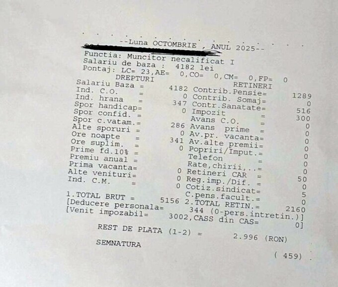 Astfel, în luna octombrie 2025, un muncitor necalificat cu un salariu de bază de 4182 de lei, la care se adaugă diverse sporuri, ajungând la un total brut de 5156 de lei, rămâne în final cu un rest de plată de 2996 de lei.