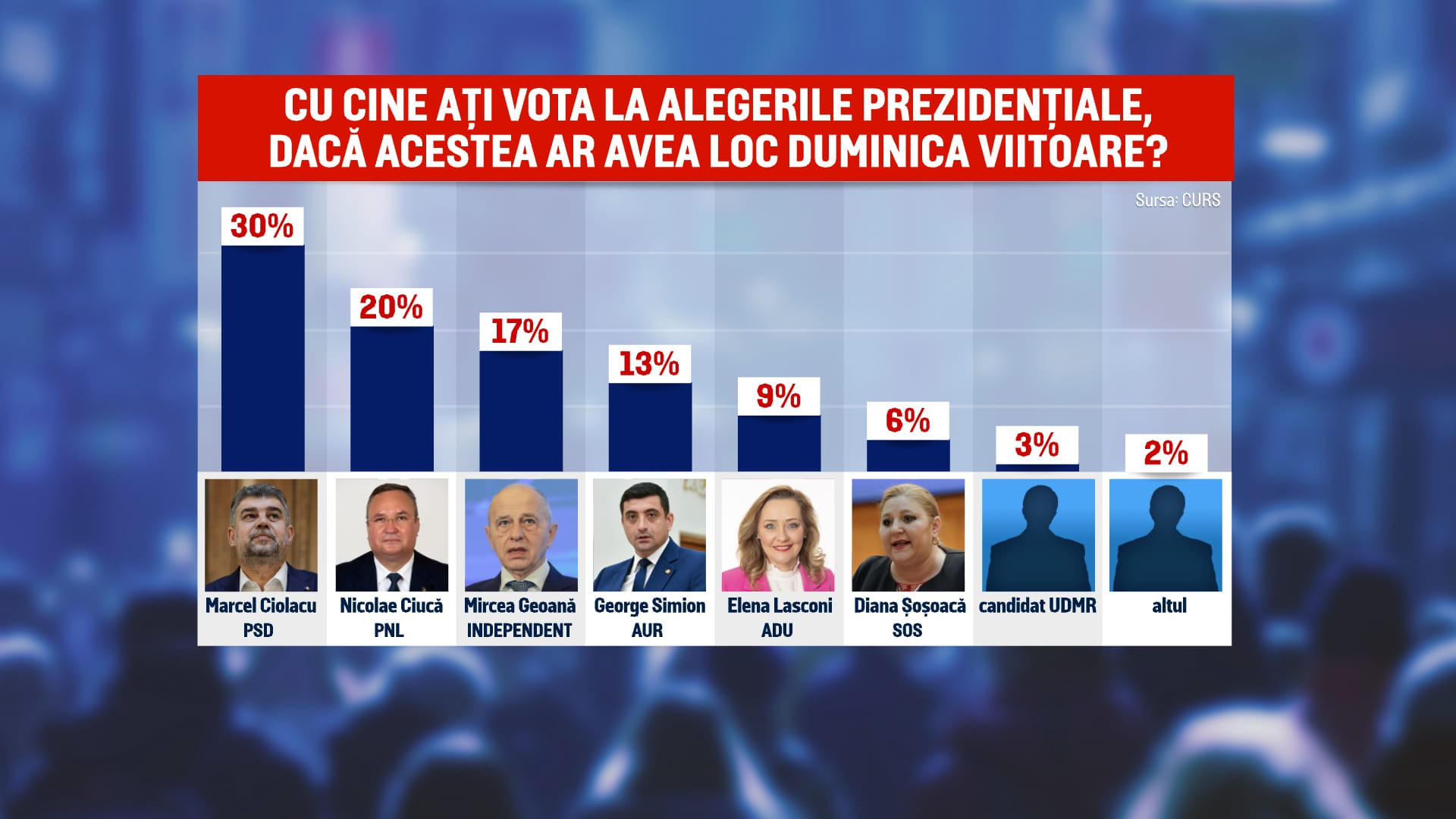 În sondajul INSCOP, pe primul loc în intențiile de vot pentru prezidențiale cu un procent de 26,7% din voturi este Mircea Geonă, urmat de liderul PSD Marcel Ciolacu.