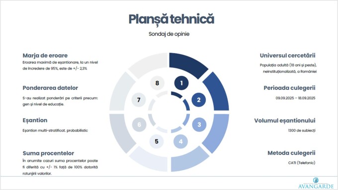 Sondajul a fost relizat telefonic, în perioada 9-18 septembrie 2025, pe un eşantion reprezentativ de 1.300 de persoane, cu o eroare maximă admisă a datelor este de ± 2,3%, la un grad de încredere de 95%.
