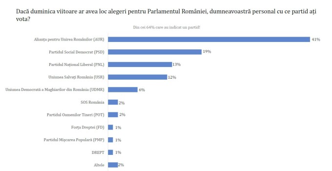 Rezultatele sondajului arată că AUR asr obţine 41%, urmat de PSD cu 19%, PNL cu 13%, USR cu 12% şi UDMR cu 6%.