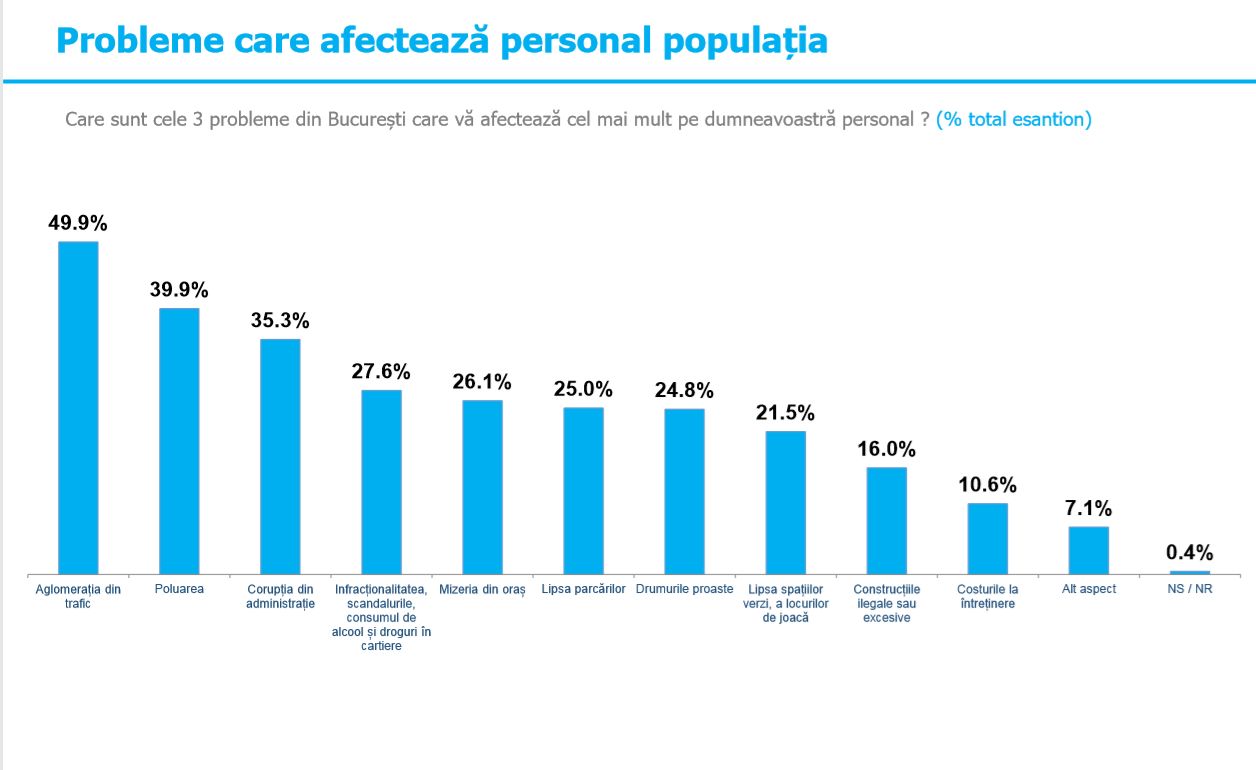 Cele mai mari probleme care îi afectează pe bucureșteni sunt, potrivit sondajului Inscop, aglomerația din trafic, poluarea, corupția din administrație, infracționalitatea și scandalurile, mizeria și lipsa parcărilor.