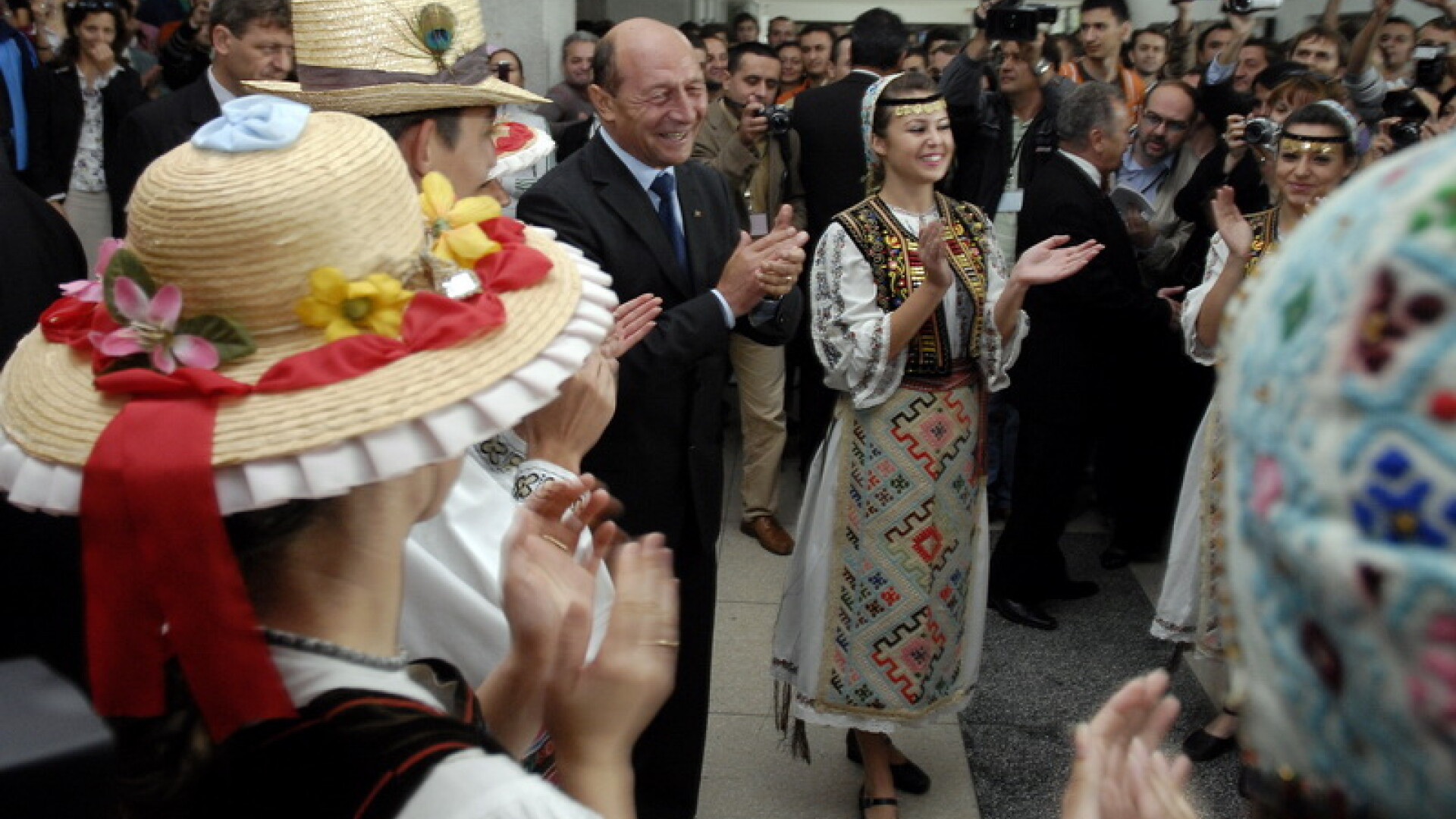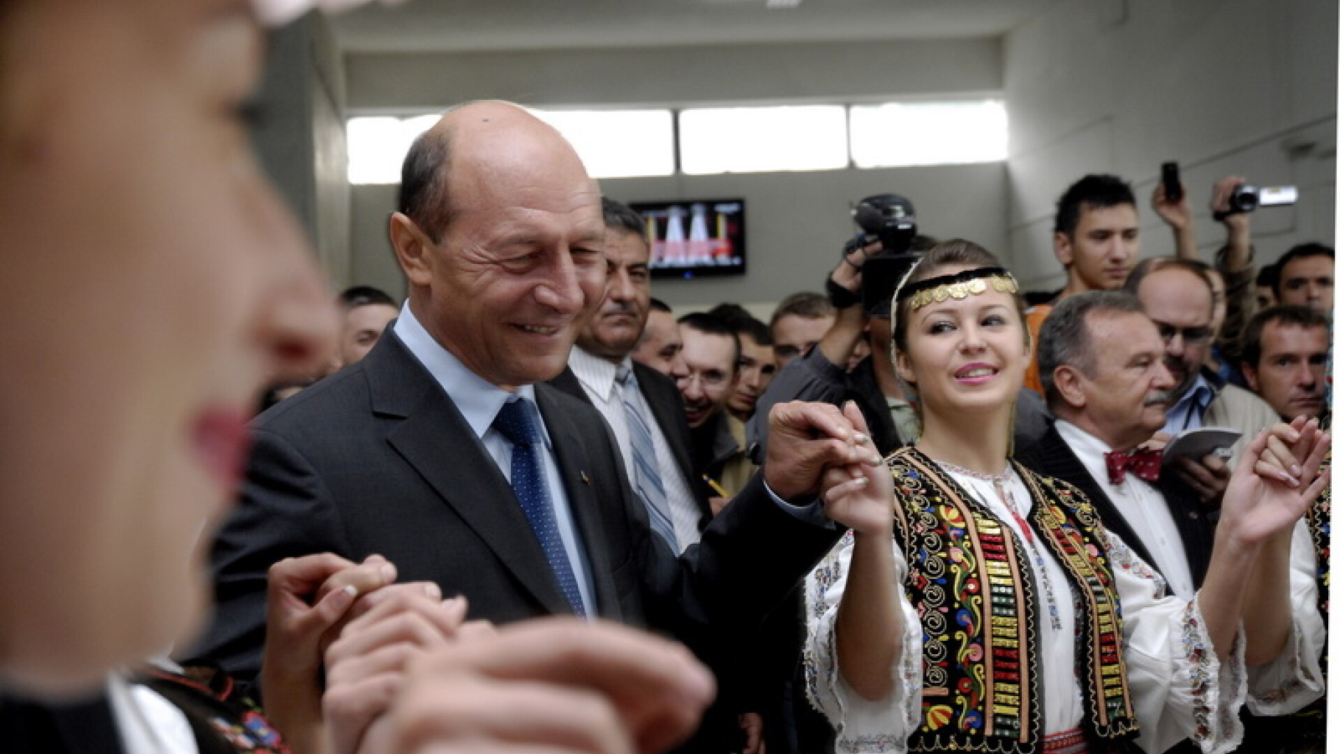 Presedintele Traian Basescu s-a prins intr-o hora la sediul Facultatii de Mecanica din cadrul Universitatii Tehnice (UTCN) din Cluj-Napoca, fiind invitat de doua studente ale Ansamblului "Romanasul " al universitatii.
