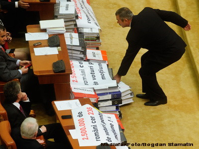 16.34 Premierul Emil Boc a fost surprins de actiunea unor parlamentari ai opozitiei, care au venit langa el, in timp ce se afla la microfonul plenului Parlamentului, si au aruncat in jurul sau mai multe dosare. Seful Executivului a renuntat atunci sa mai ia cuvantul si s-a intors la prezidiu.