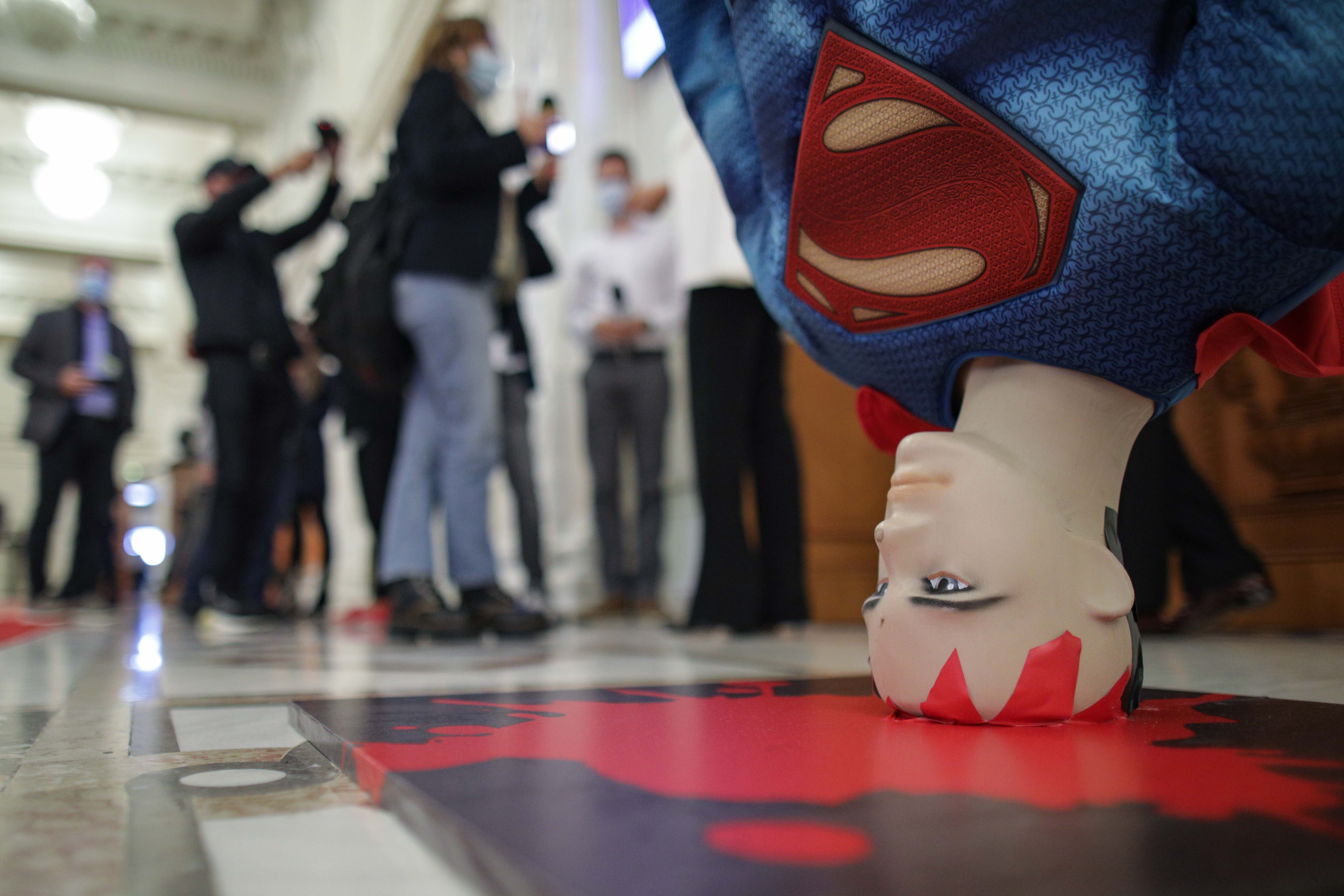 PSD a adus o machetă cu Superman în faţa sălii de plen de la Camera Deputaţilor, pe unde vor intra parlamentarii şi membrii Guvernului.